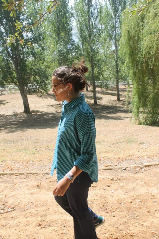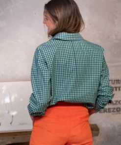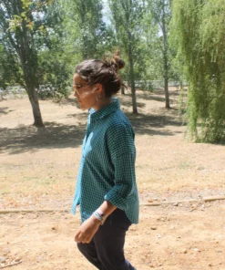 Camisa ligeramente oversize, en cuadrito vichy en tonos azul y verde turquesa, realizado en un tejido de algodón suave.