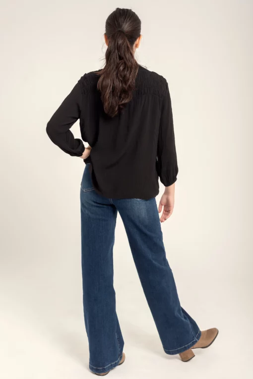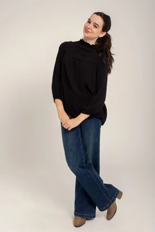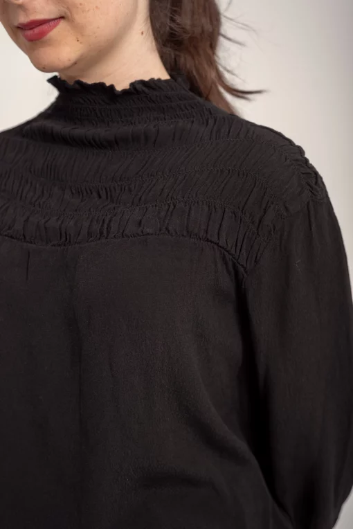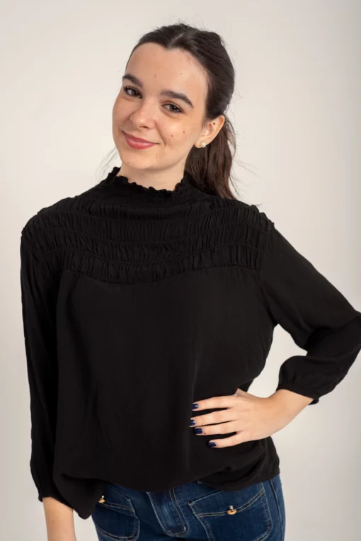 Blusa crepe con goma del pecho al cuello chimenea. Manga francesa con goma en el puño. Corte fluido. Un básico perfecto para toda la temporada.