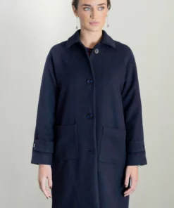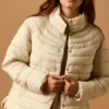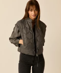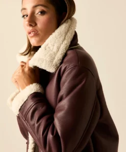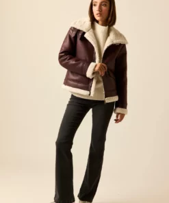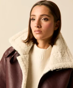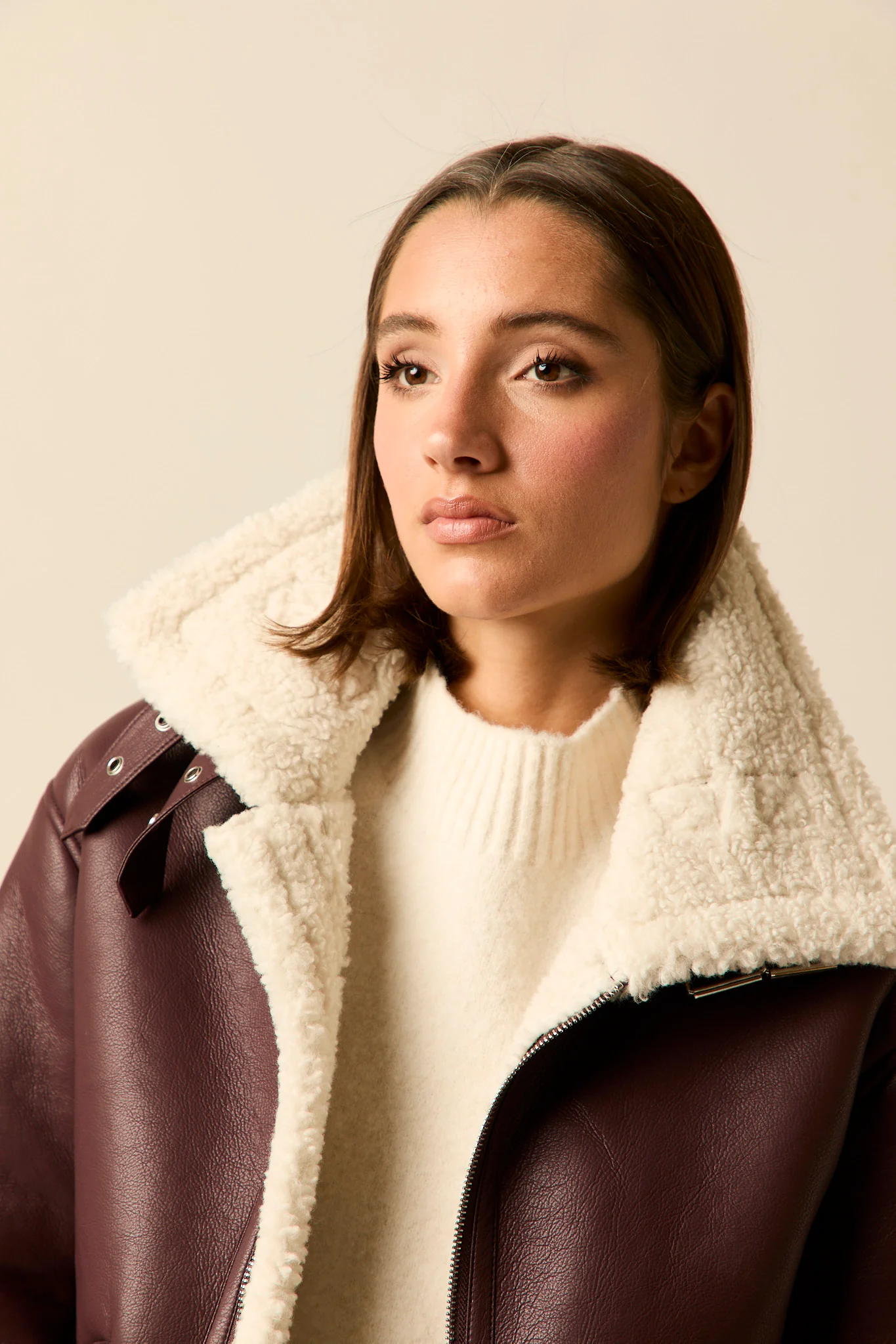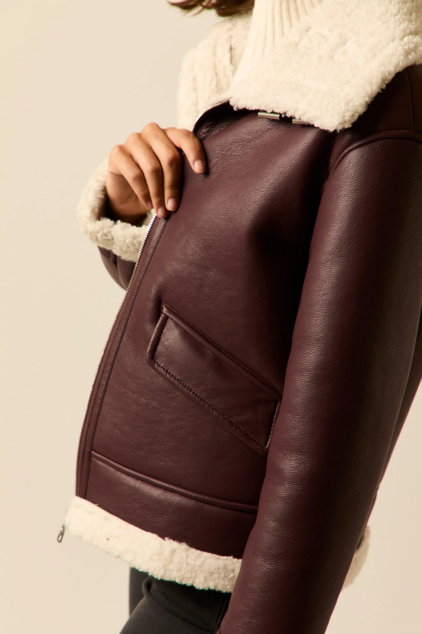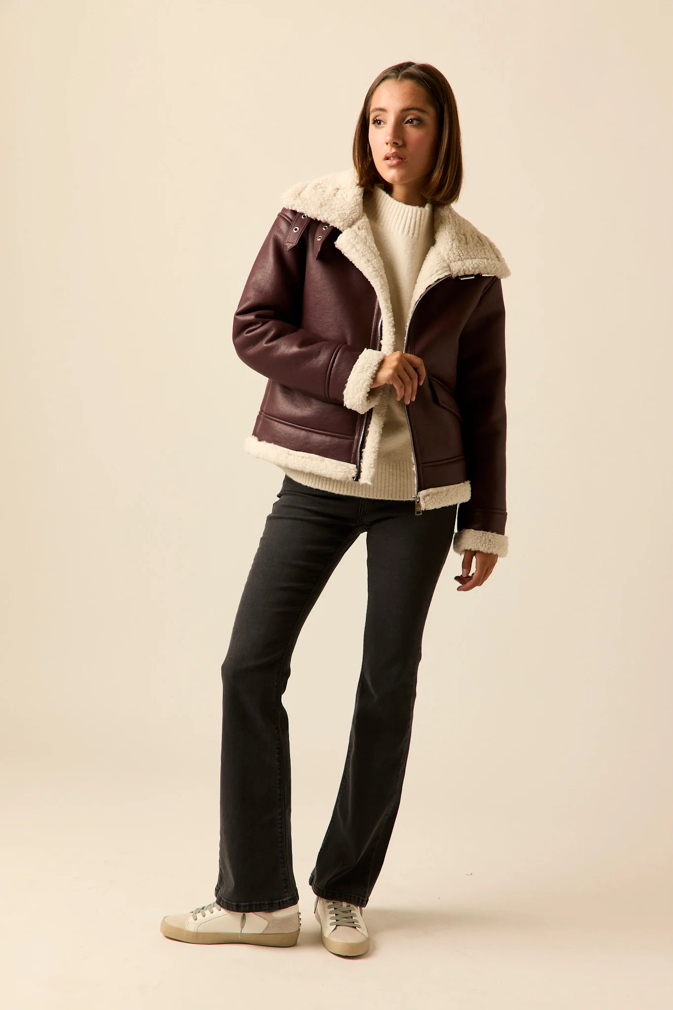 Cazadora de cuello solapa en color granate. Manga larga, bolsillos delanteros, forro interior y acabados con tejido combinado en borreguillo. Detalle de cierre de hebilla en el cuello y cierre frontal con cremallera.