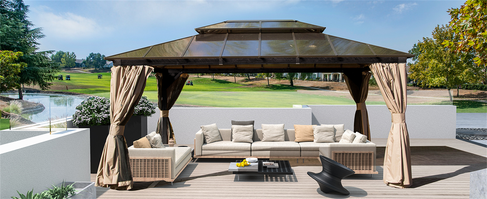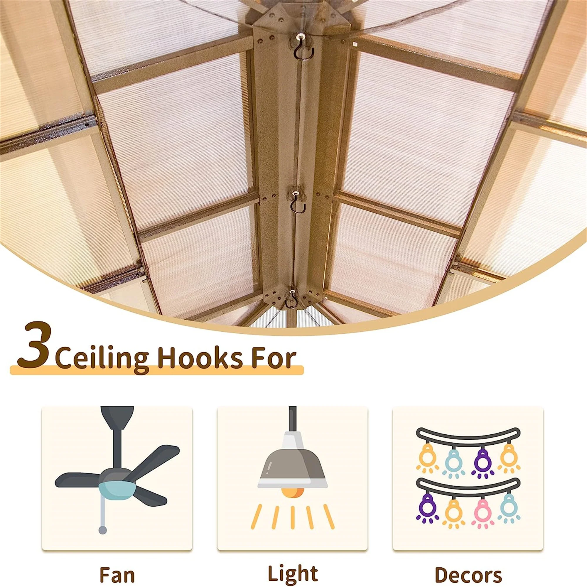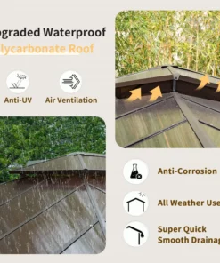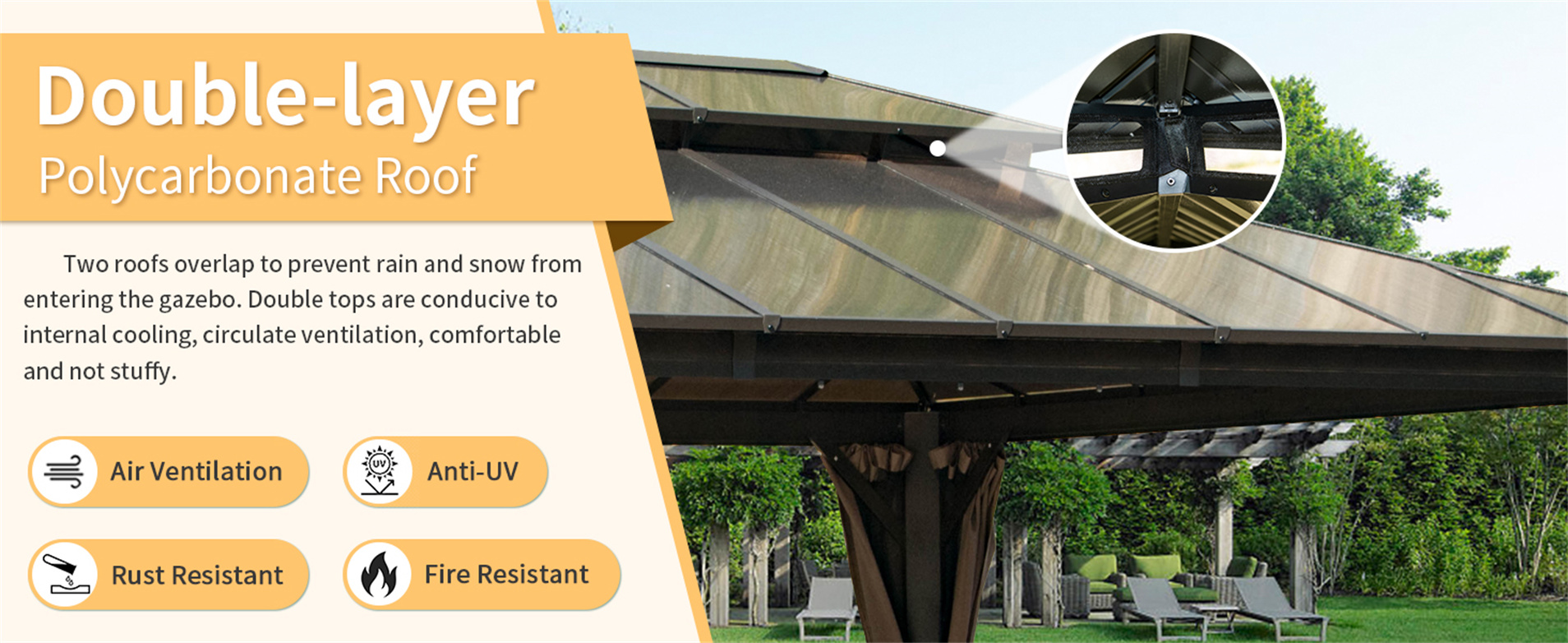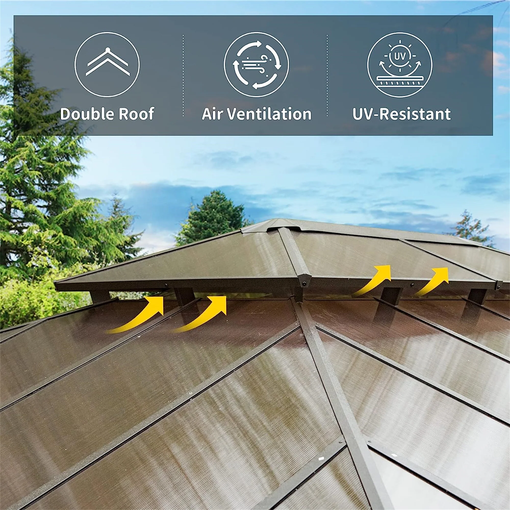 - 【DISEÑO DE DOBLE SUPERFICIE VENTILADA】Este cenador de patio al aire libre está diseñado con un techo de policarbonato de doble capa ventilado para brindar un espacio saludable y aireado. El techo de policarbonato puede bloquear el 99% de los rayos UV dañinos al tiempo que reduce el calor de la luz solar.