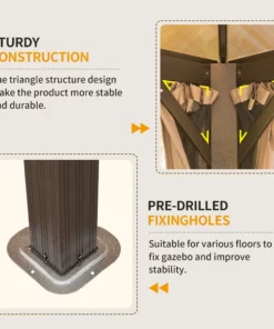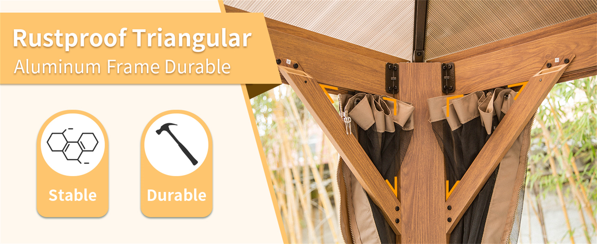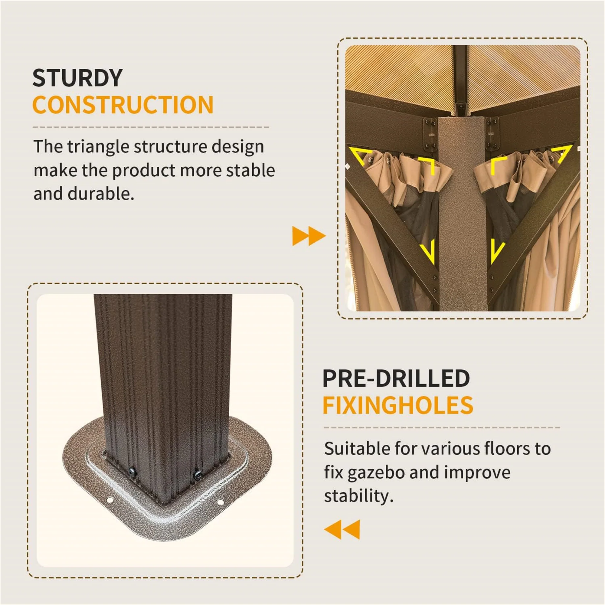 - 【MARCO DE ALUMINIO RESISTENTE】Los cenadores para patios cuentan con un fuerte marco de aluminio marrón oscuro con recubrimiento de polvo, resistente a la decoloración, el óxido y la corrosión. Viene con una base pretaladrada para cada poste. Sugerimos utilizar tornillos de expansión para que todo el sistema sea mucho más estable. Las 4 esquinas adoptan un diseño triangular estable reforzado para años de durabilidad y seguridad.