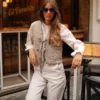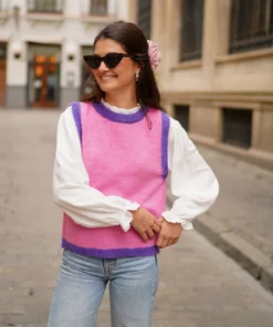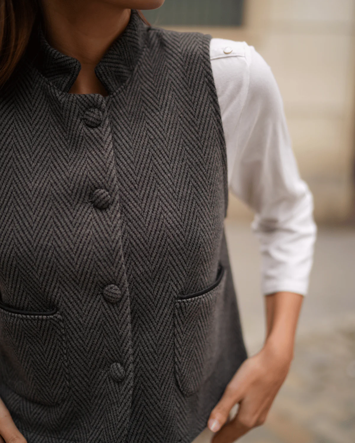 - Chaleco corto con estampado de espigas, cuello alto y manga sisa.