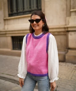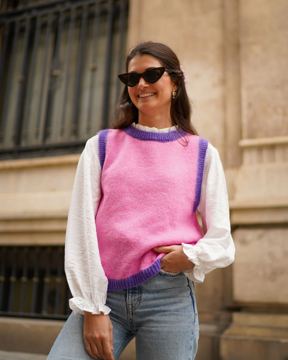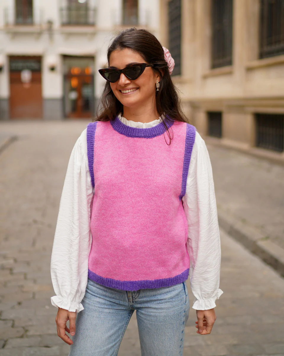 - Chaleco de punto con acabados en rib de color haciendo contraste.