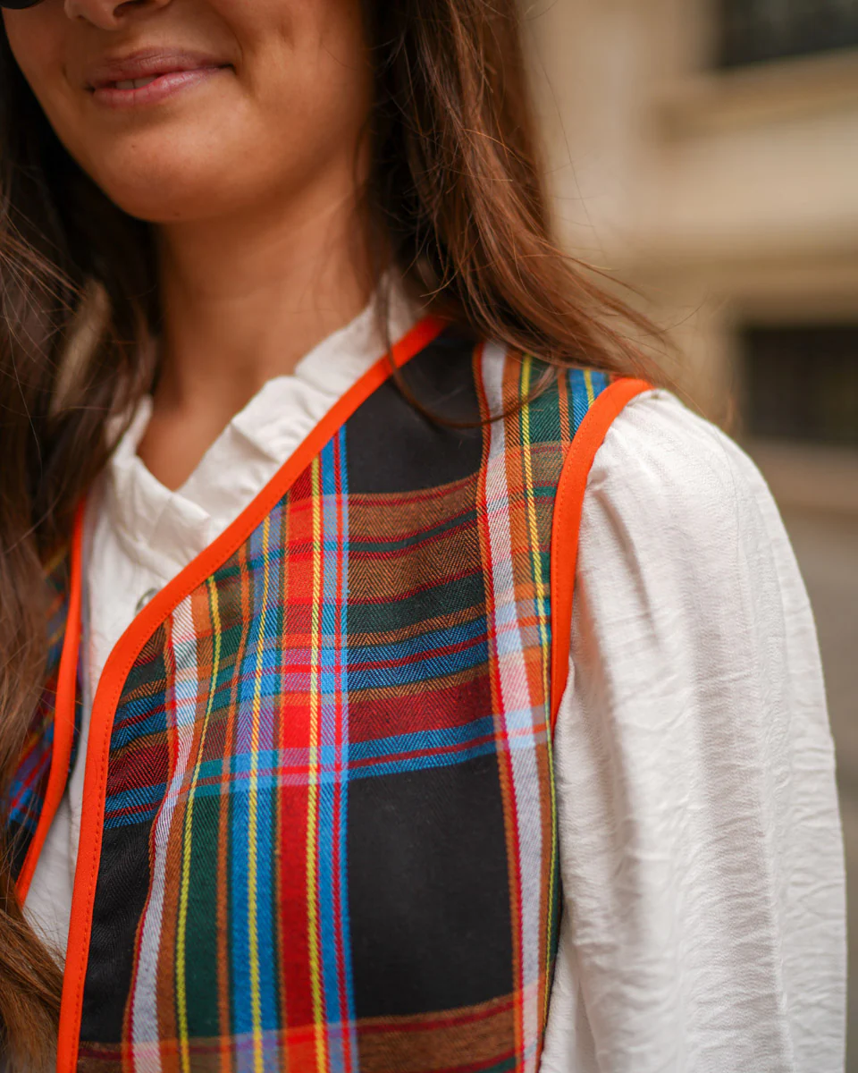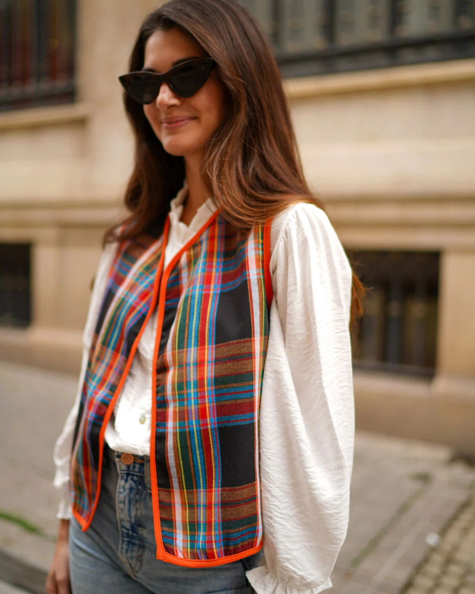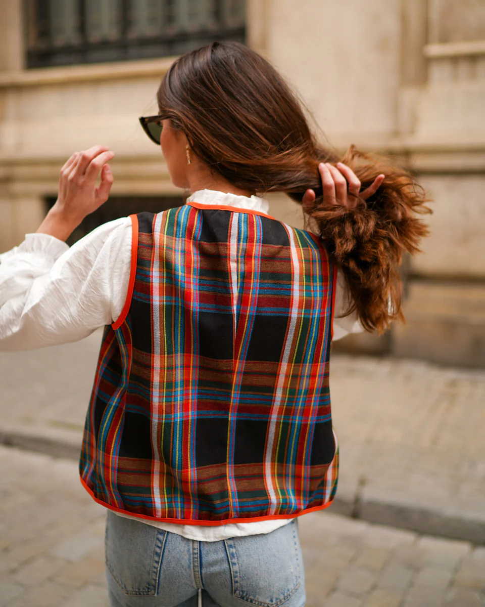 - Chaleco de cuadro escocés abierto con bordes haciendo contraste.
