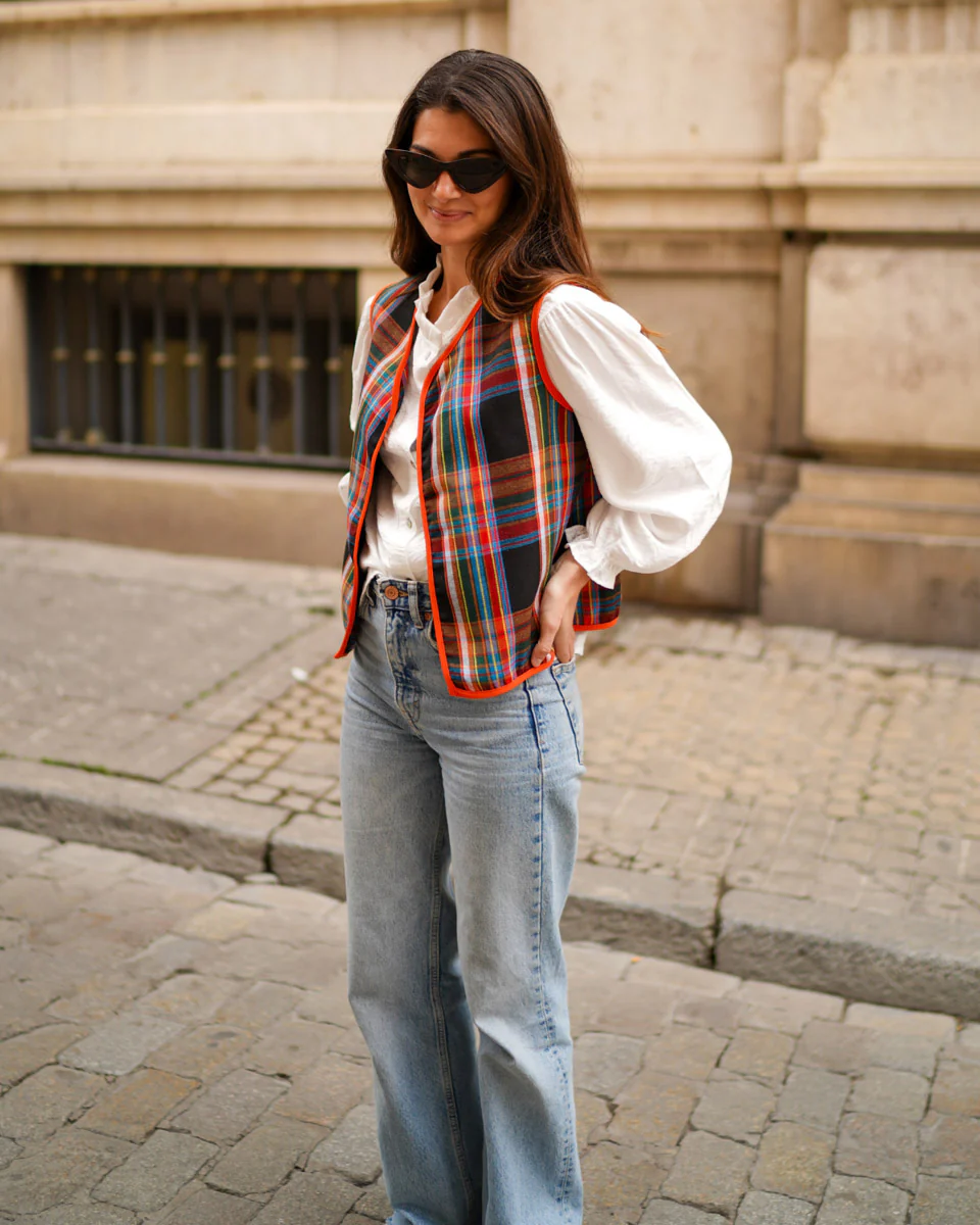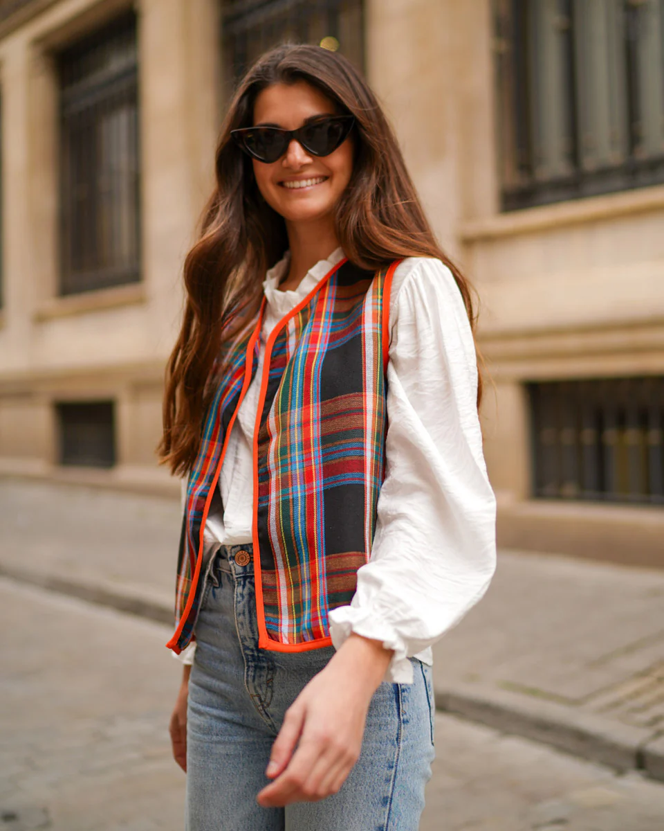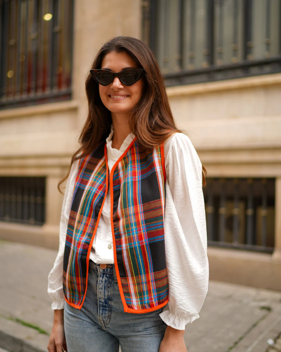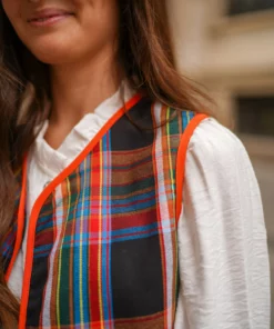 - Chaleco de cuadro escocés abierto con bordes haciendo contraste.