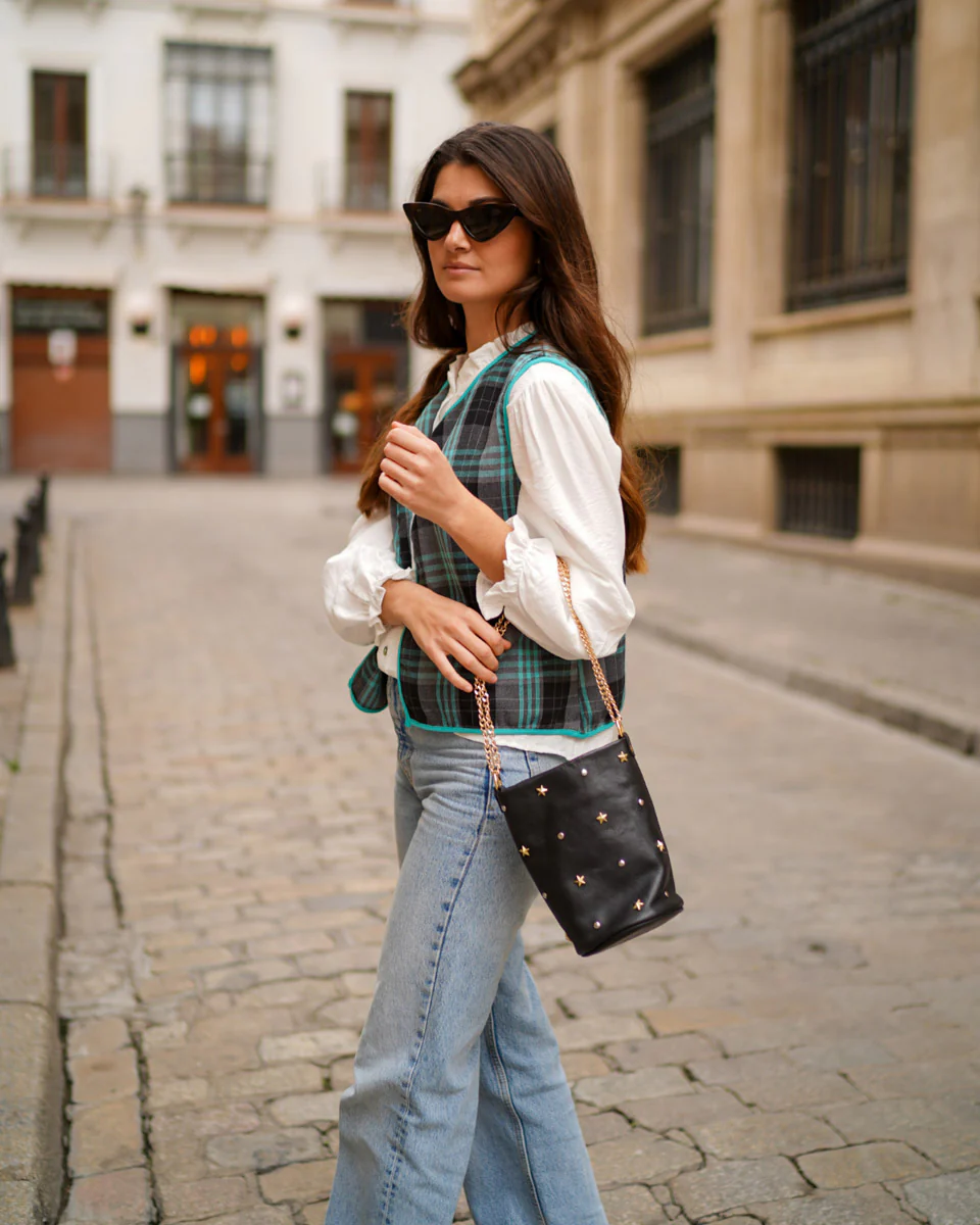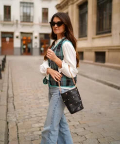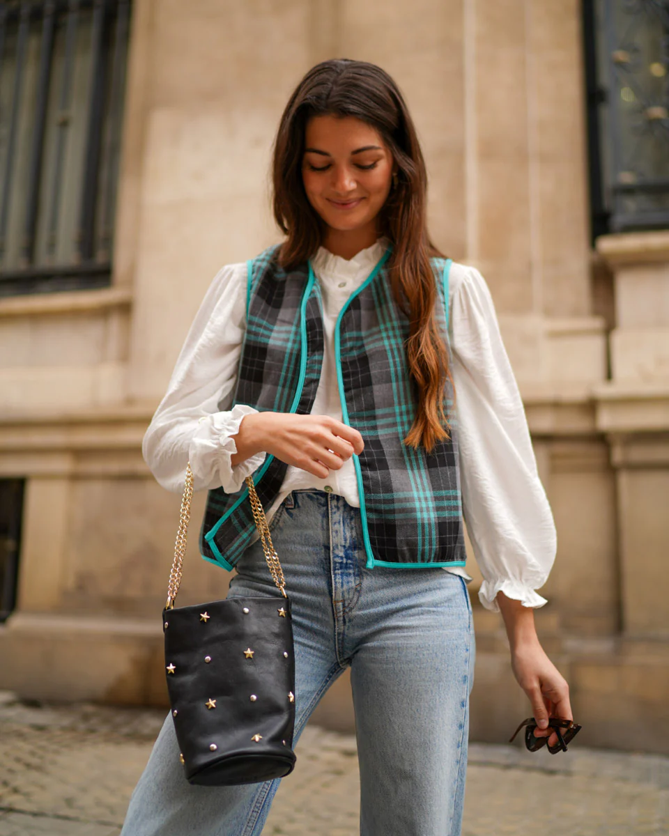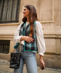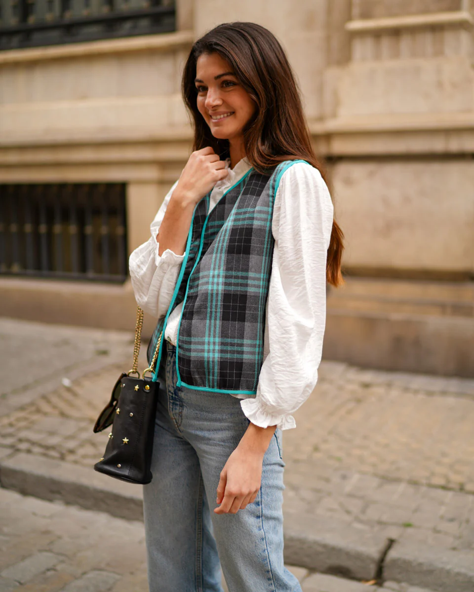 - Chaleco de cuadro escocés abierto con bordes haciendo contraste.