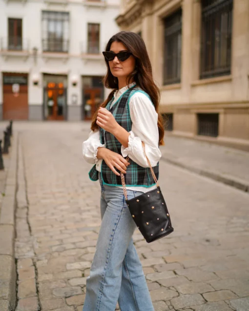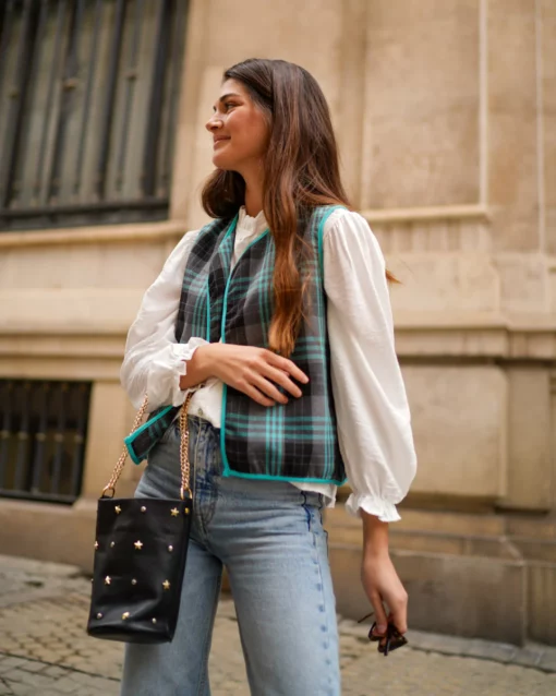 - Chaleco de cuadro escocés abierto con bordes haciendo contraste.