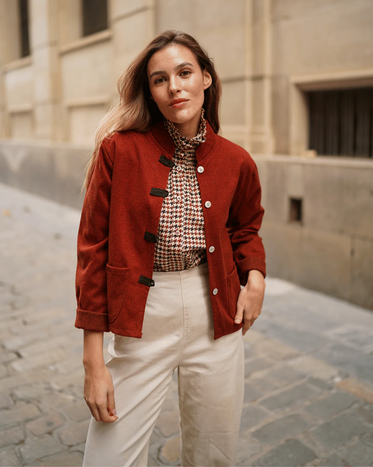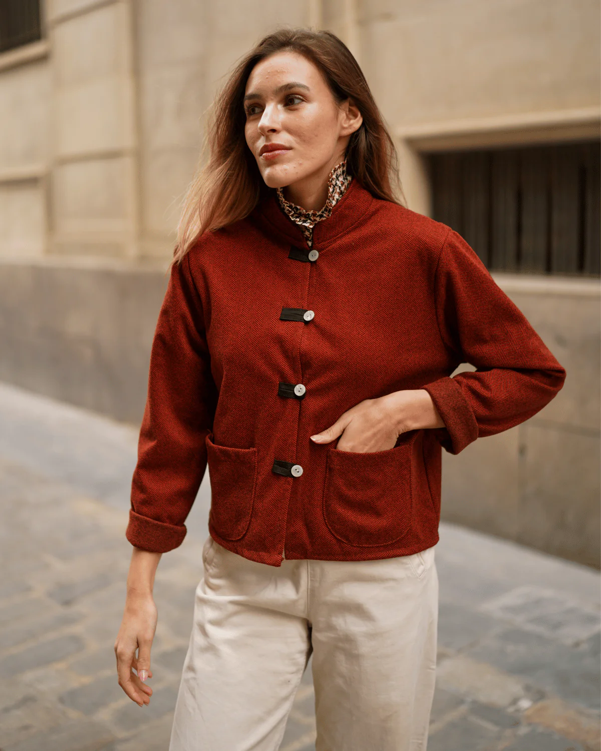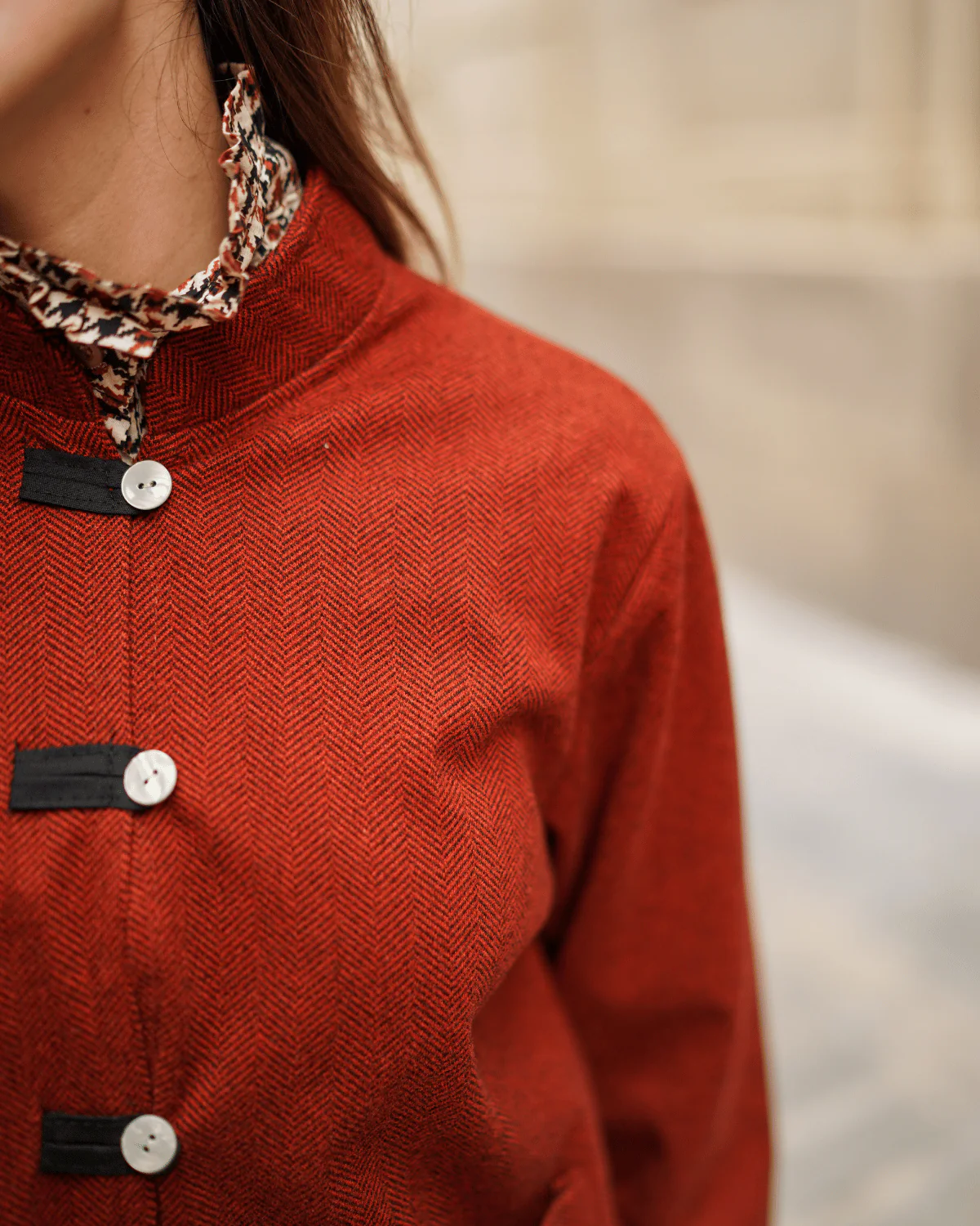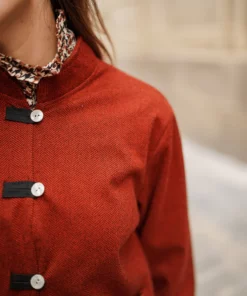 - Cierre frontal con botones anacarados.