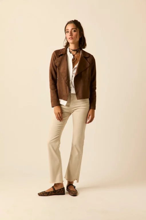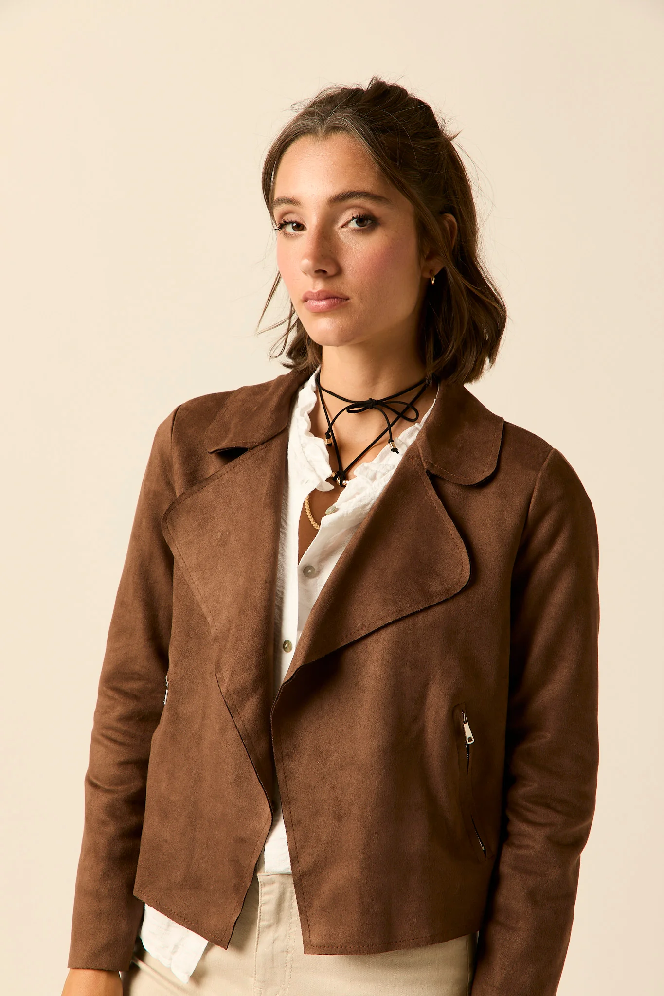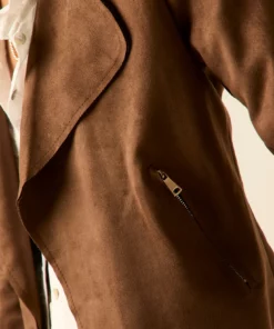 Chaqueta de ante en color marrón chocolate. Cuello de solapa, manga larga y bolsillos laterales con cierre de cremallera.