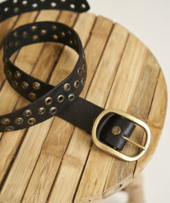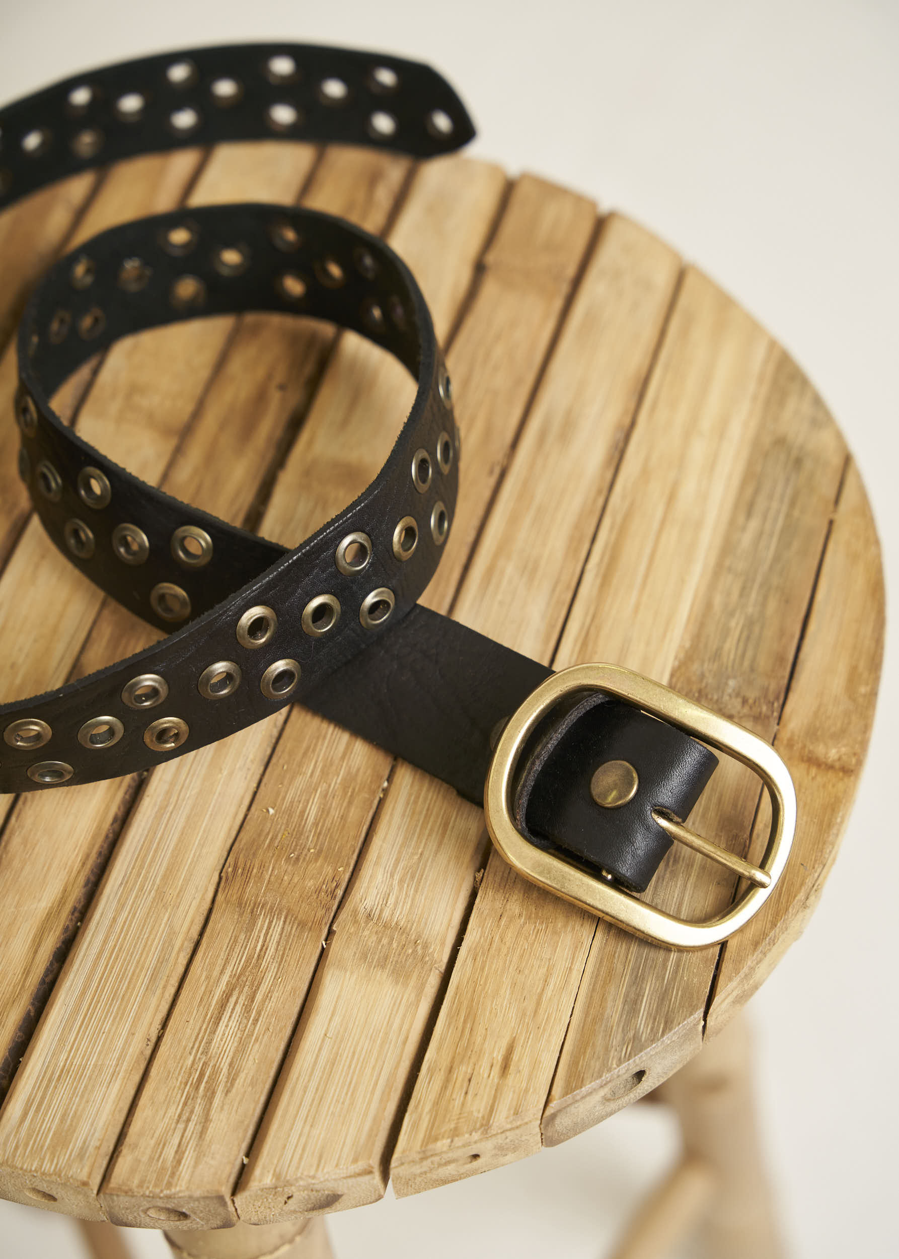 Cinturón 100% piel con detalle de tachas en color negro y hebilla dorada.