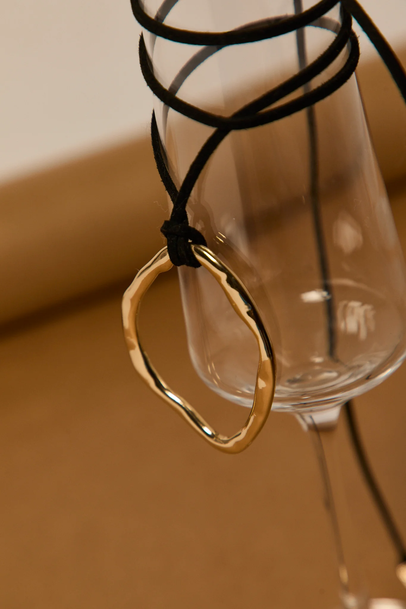 Colgante de cuerda de terciopelo en color negro con círculo dorado.