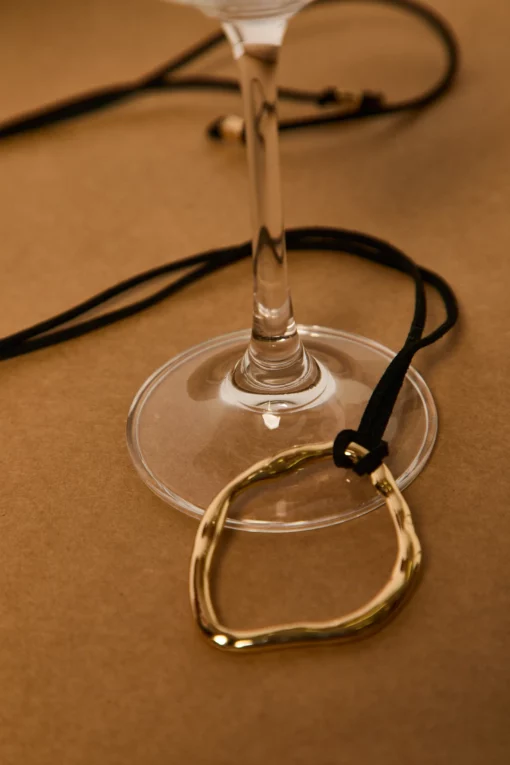Colgante de cuerda de terciopelo en color negro con círculo dorado.