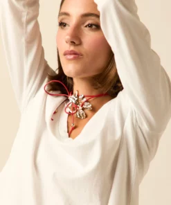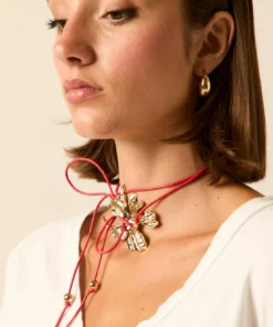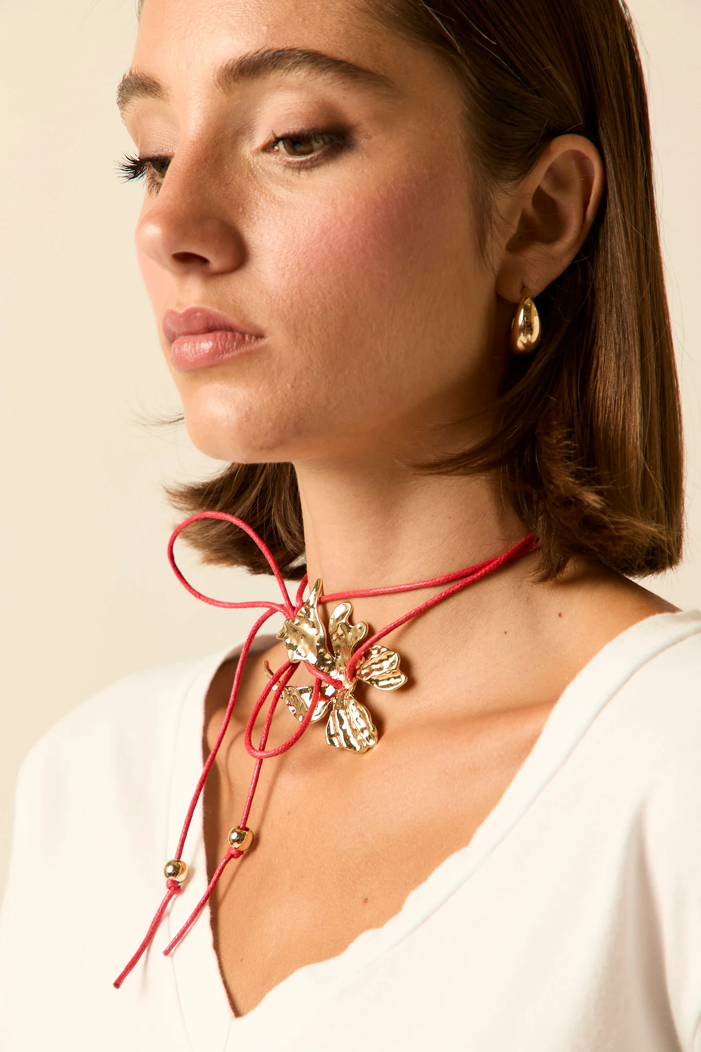 Colgante de cuerda de terciopelo en color rojo con flor dorada.