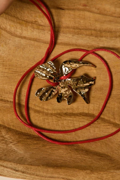 Colgante de cuerda de terciopelo en color rojo con flor dorada.