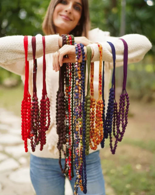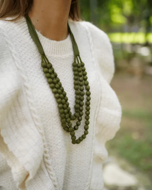 - Collar hecho a mano con bolas de madera y tela.