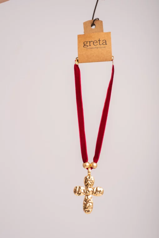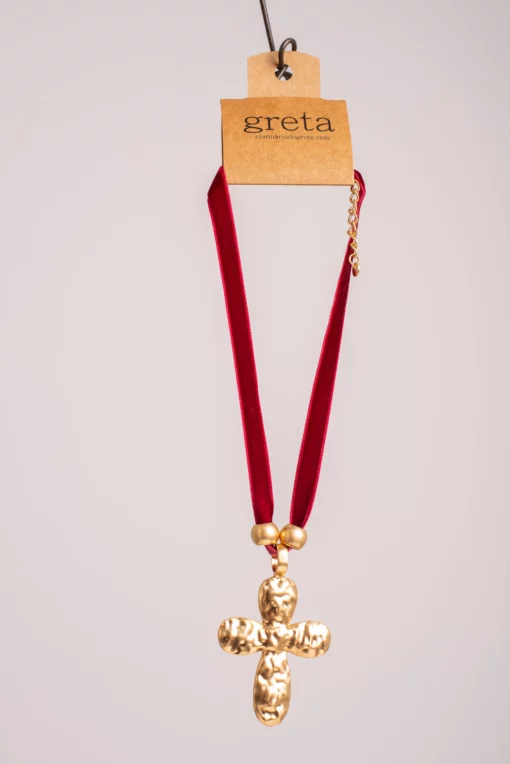 Collar corto, cinta de terciopelo. Colgante de cruz dorada.