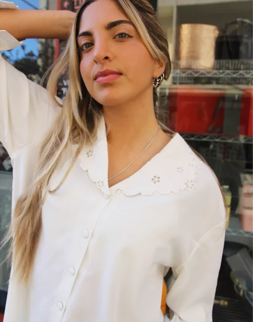 Measurements: 42″/ 107cm bust – 21″ / 53cm sleeve length – 26″ / 66cm blouse length.