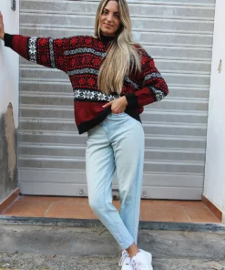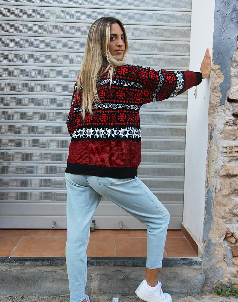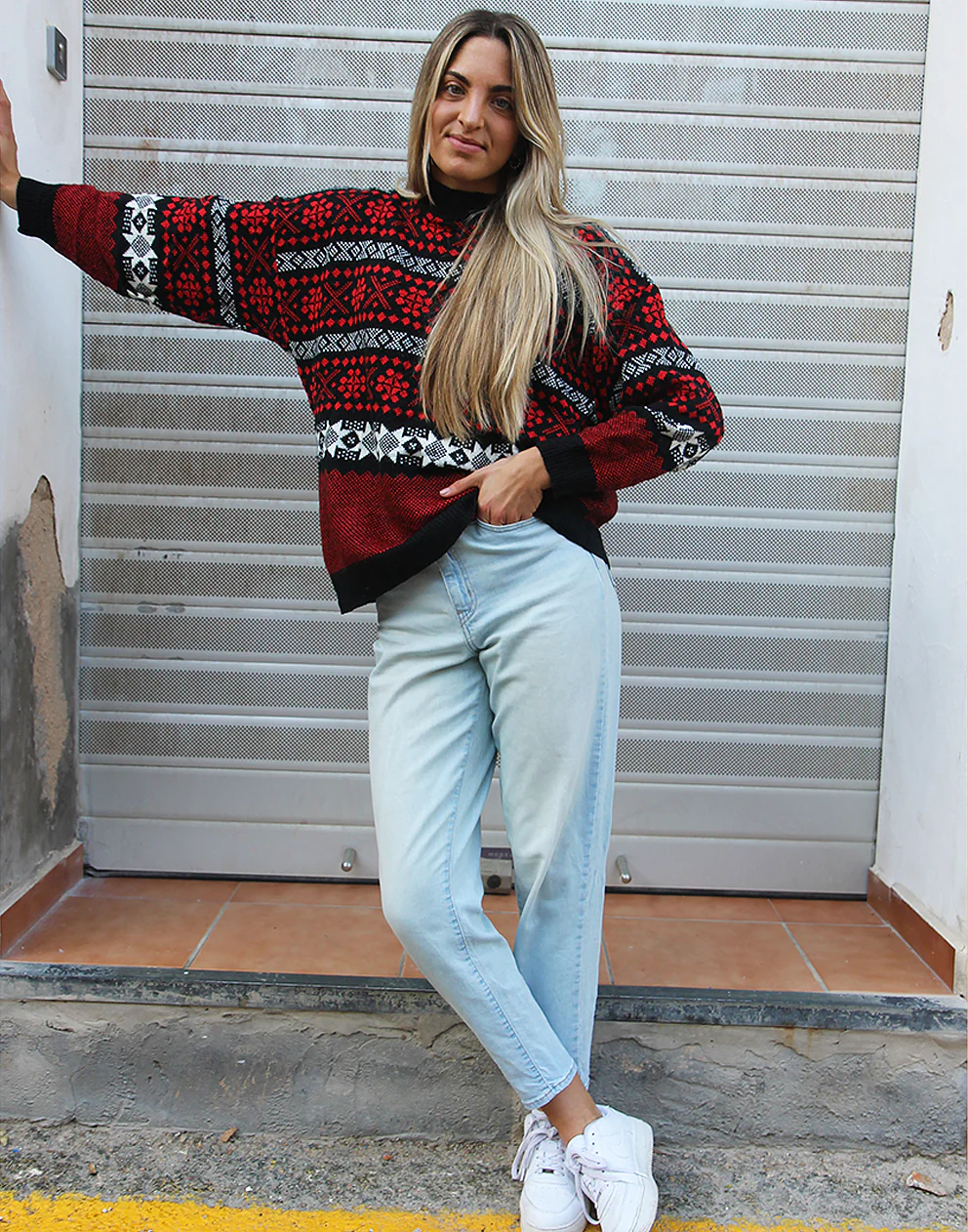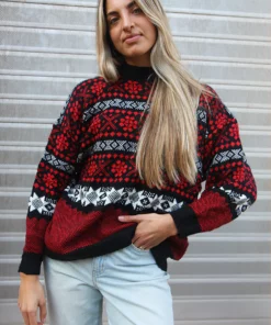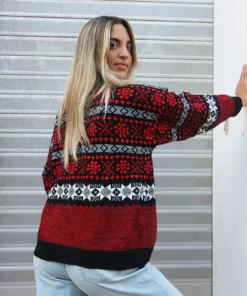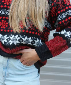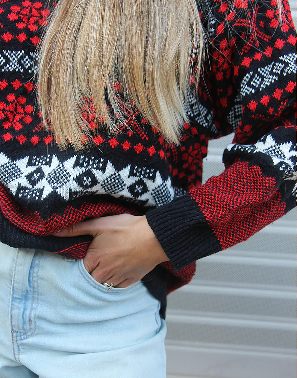 Crew Neck Jumper in Black & Red Fair Isle Print
