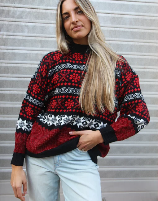 Crew Neck Jumper in Black & Red Fair Isle Print