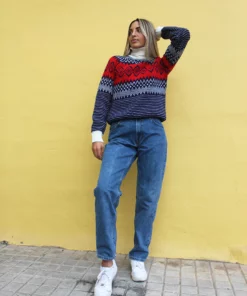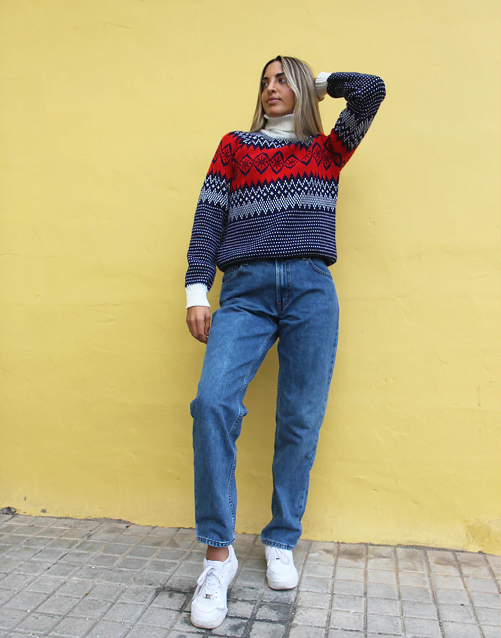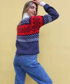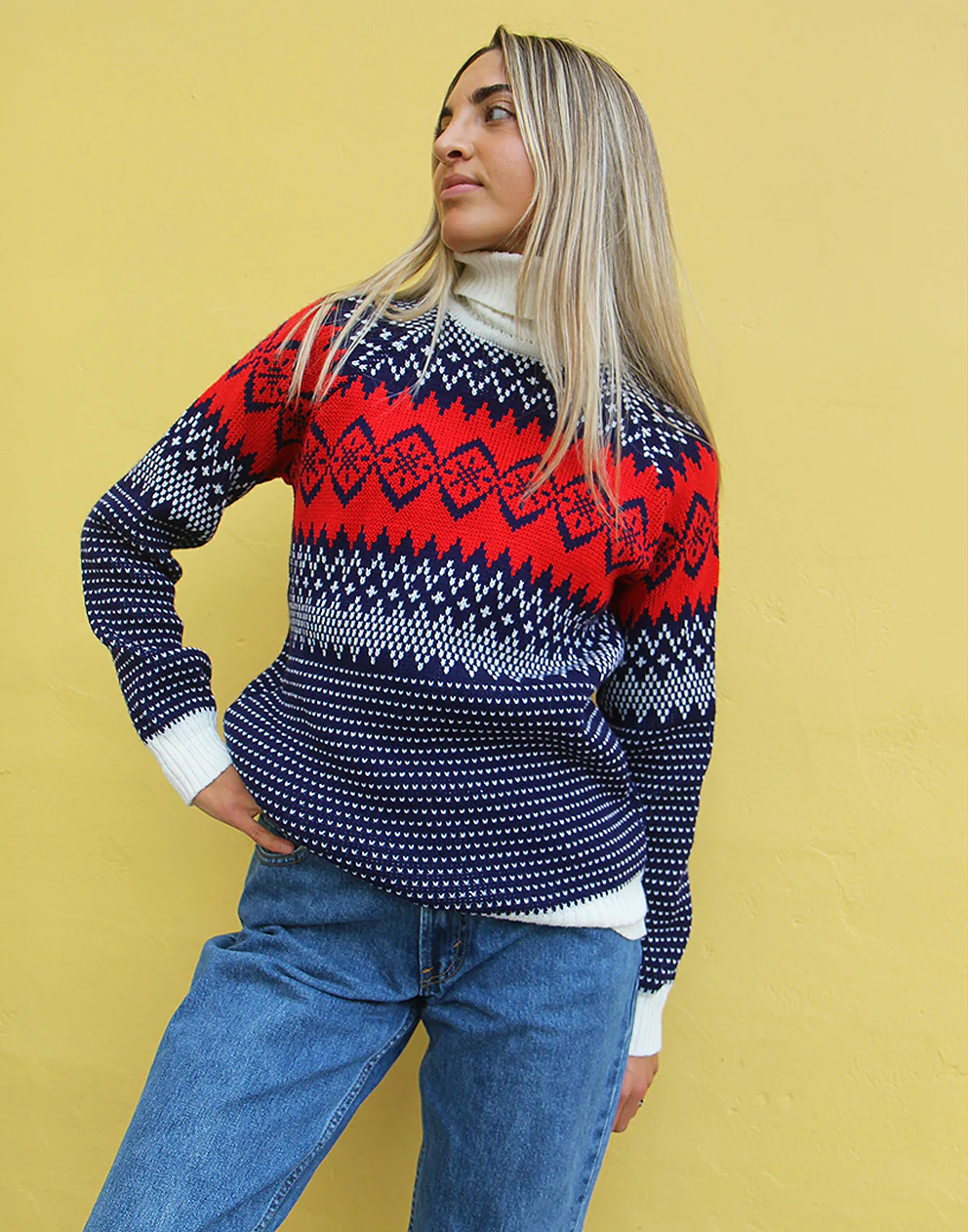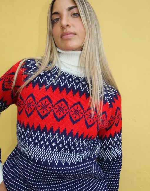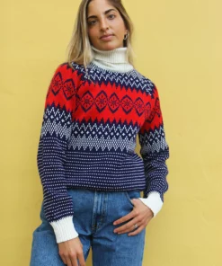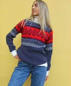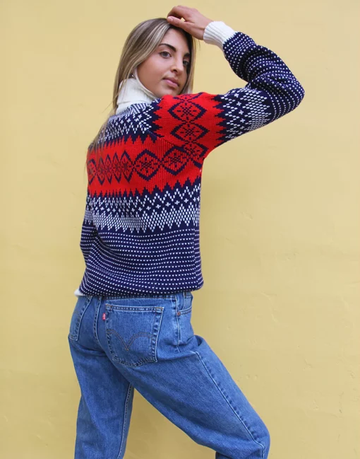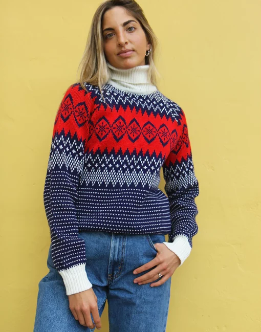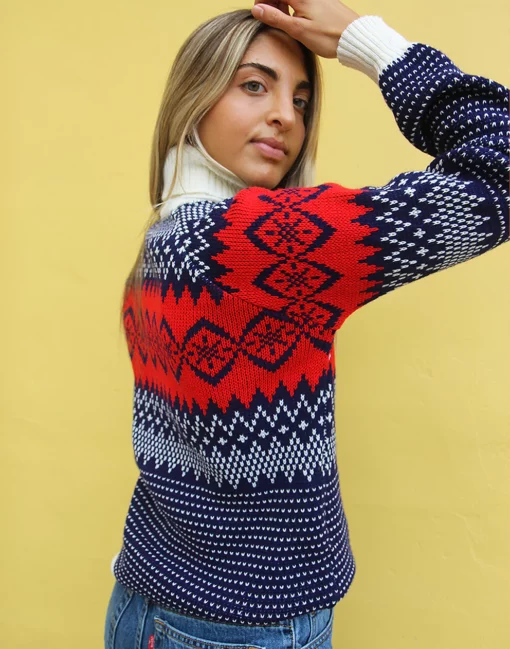 Turtle neck sweater in a blue and white fair isle print.