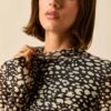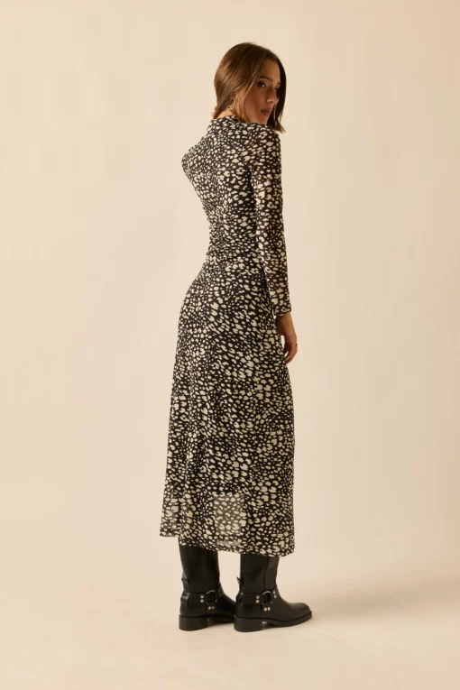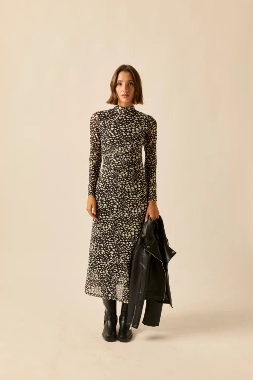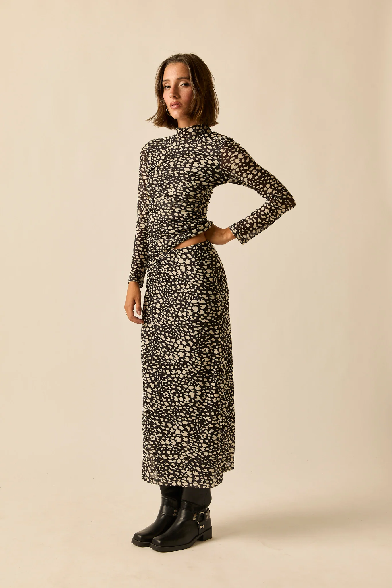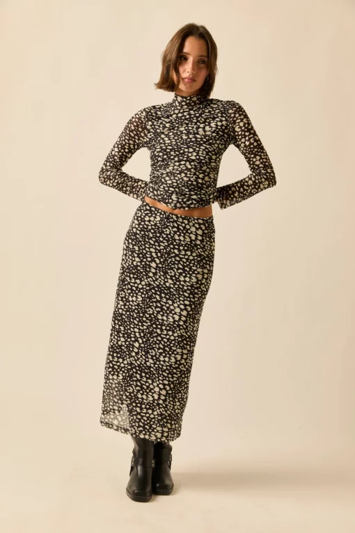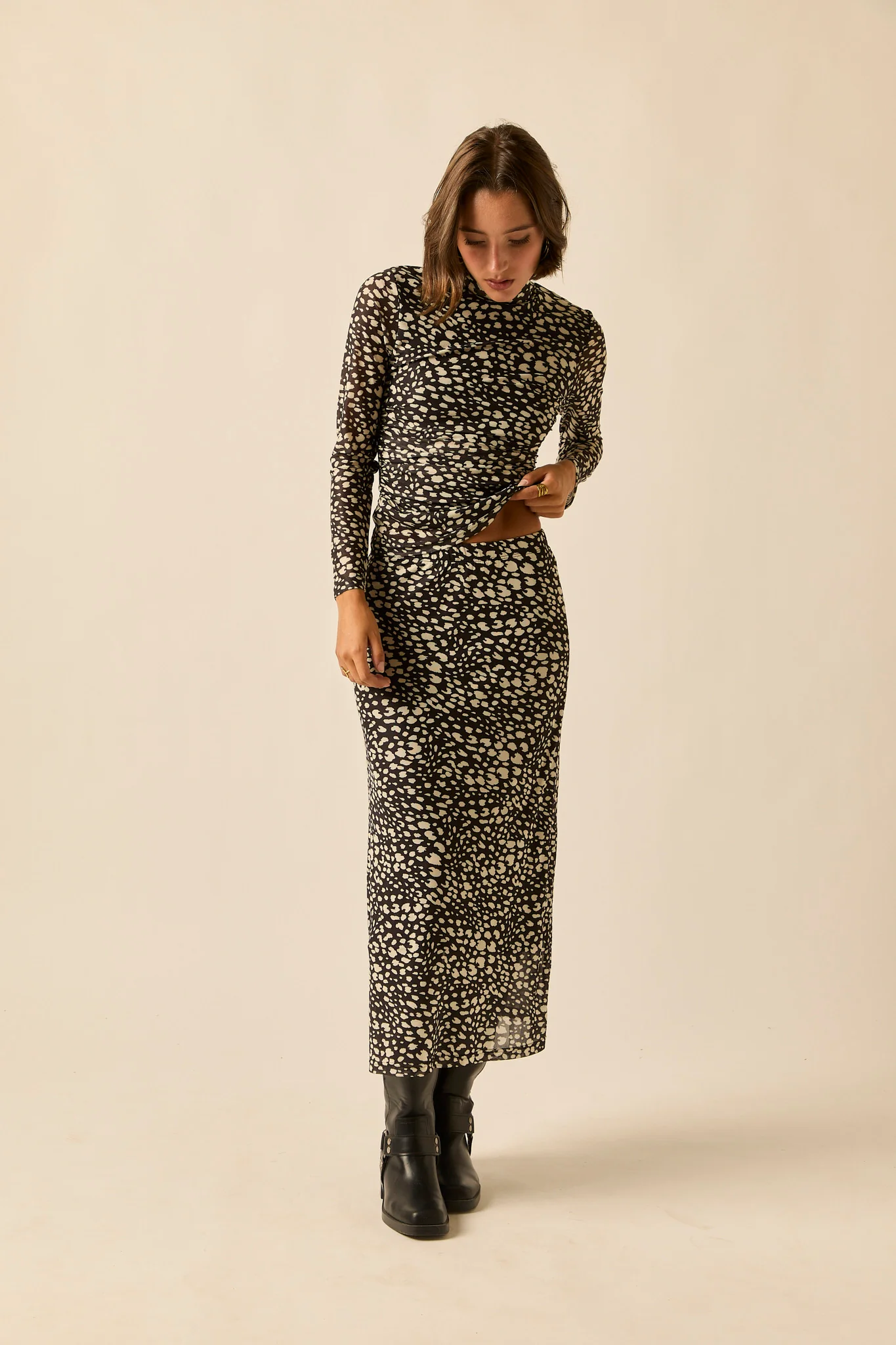 Falda midi de tul con estampado cow print bicolor en tonos negro y beige. Tiro medio, cintura elástica, diseño recto y forro interior.