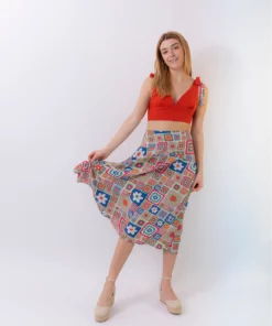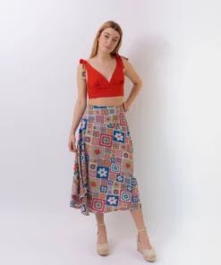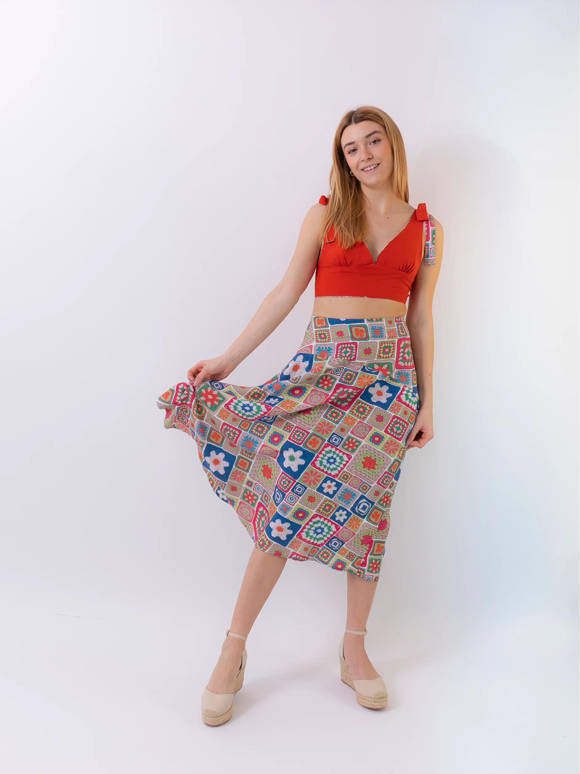 ¿Tienes que ir a trabajar esta temporada? Esta será la falda más fresquita que podrás encontrar (también sospechamos que para viajes y tomar algo es una fantasía). Estampado de colores brillantes. Falda con vista, no va forrada por dentro (no es necesario el forro, el tejido no transparenta y así es más ligera y tiene más vuelo).