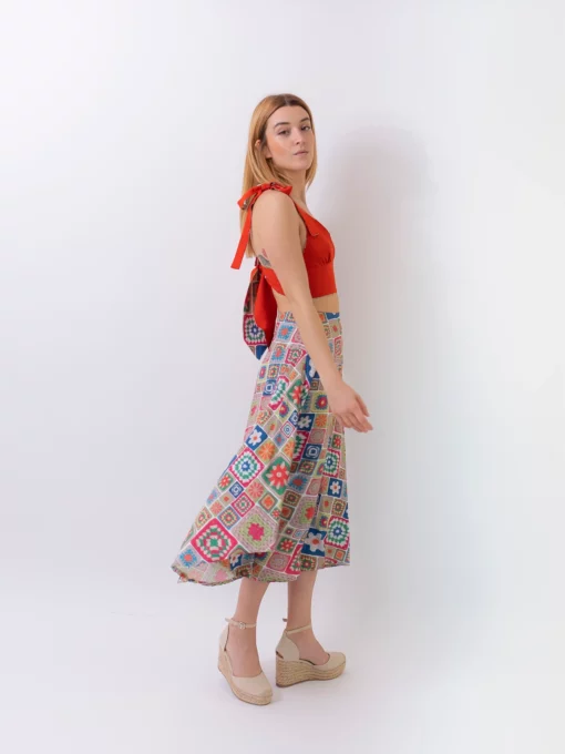¿Tienes que ir a trabajar esta temporada? Esta será la falda más fresquita que podrás encontrar (también sospechamos que para viajes y tomar algo es una fantasía). Estampado de colores brillantes. Falda con vista, no va forrada por dentro (no es necesario el forro, el tejido no transparenta y así es más ligera y tiene más vuelo).