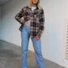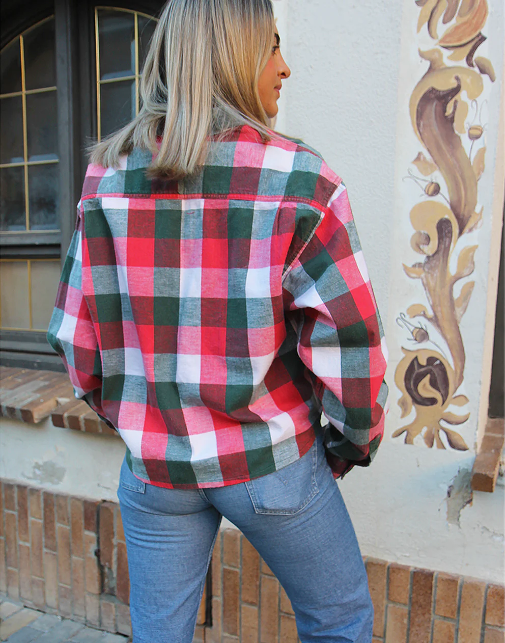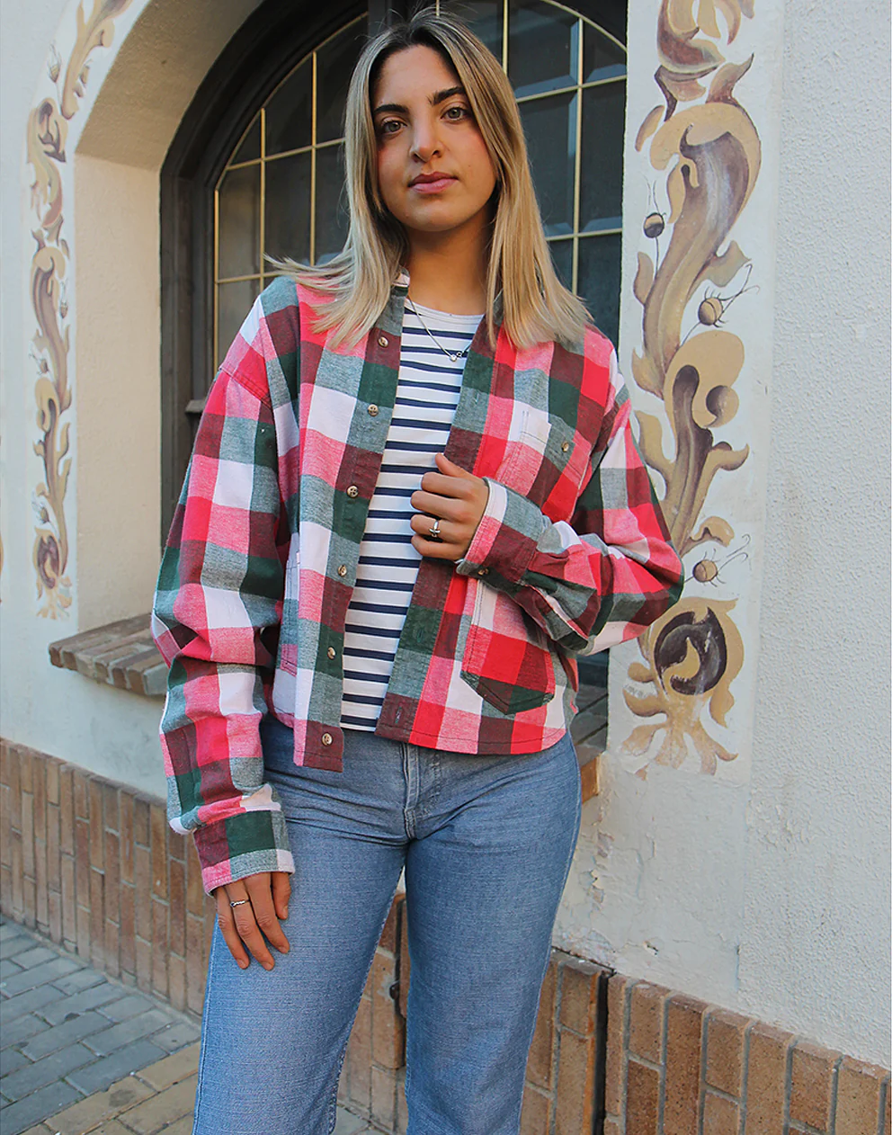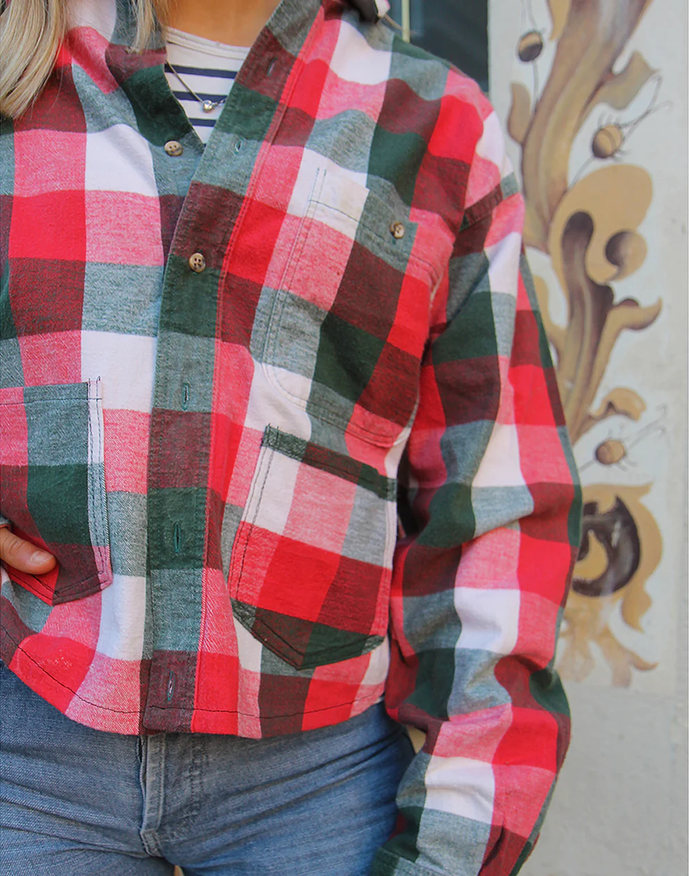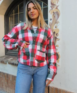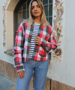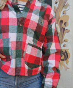 Flannel shirt in a red, white and green check.