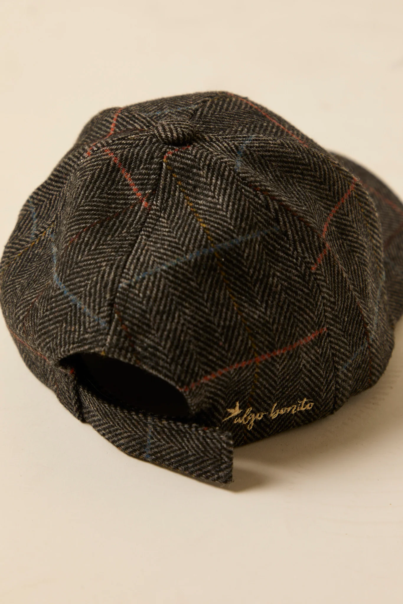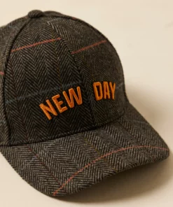 Gorra de estampado espiga en tonos grises y letras ‘New day’ en color amarillo y logo de algo bonito en la parte trasera.