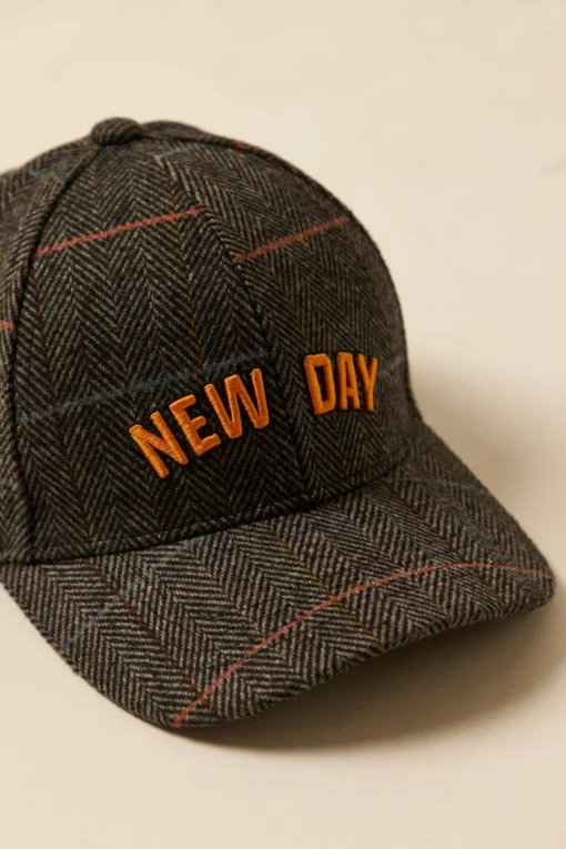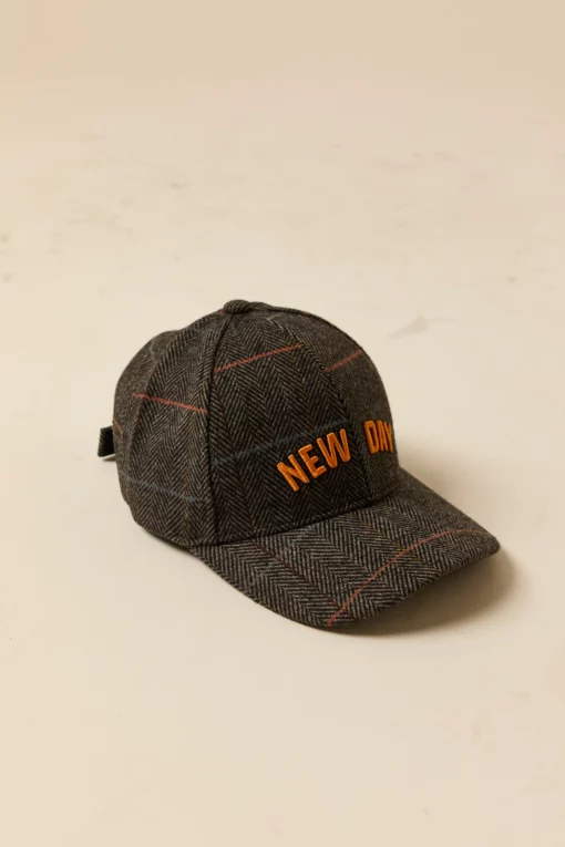 Gorra de estampado espiga en tonos grises y letras ‘New day’ en color amarillo y logo de algo bonito en la parte trasera.