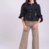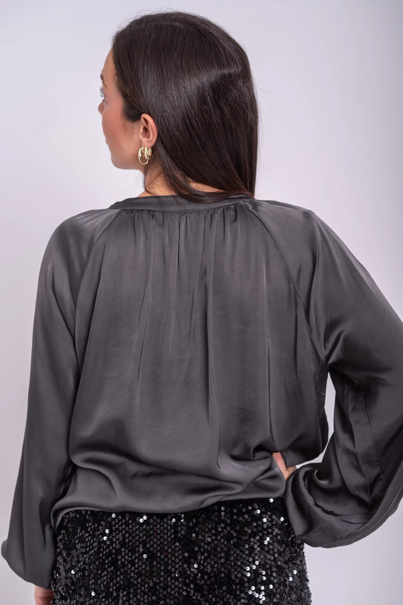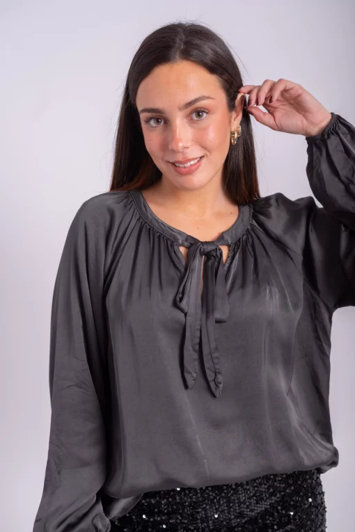 Blusa saten de cuello redondo con lazada. Manga abullonada con goma en el puño. Corte amplio. Fluida y favorecedora. Ideal para tus looks festivos de esta temporada.