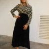Measurements: 40″/ 102cm bust – 36″ / 91cm waist – 50″ / 127cm hips -21″ / 53cm sleeve length – 56″ / 142cm dress length.