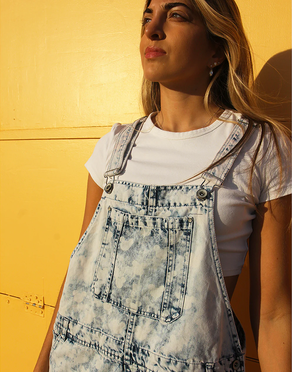 Measurements – 8.5″(22cm) top bib width – 11″(28cm) bib height – 40″(102cm) waist – 44″(112cm) hips – 12.5″(32cm) outer leg.