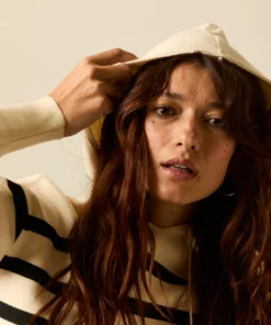 Jersey estilo oversize en color blanco con estampado de rayas en color negro. Capucha con cierre de cordones, manga larga y acabados en rib.