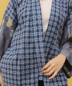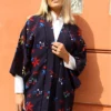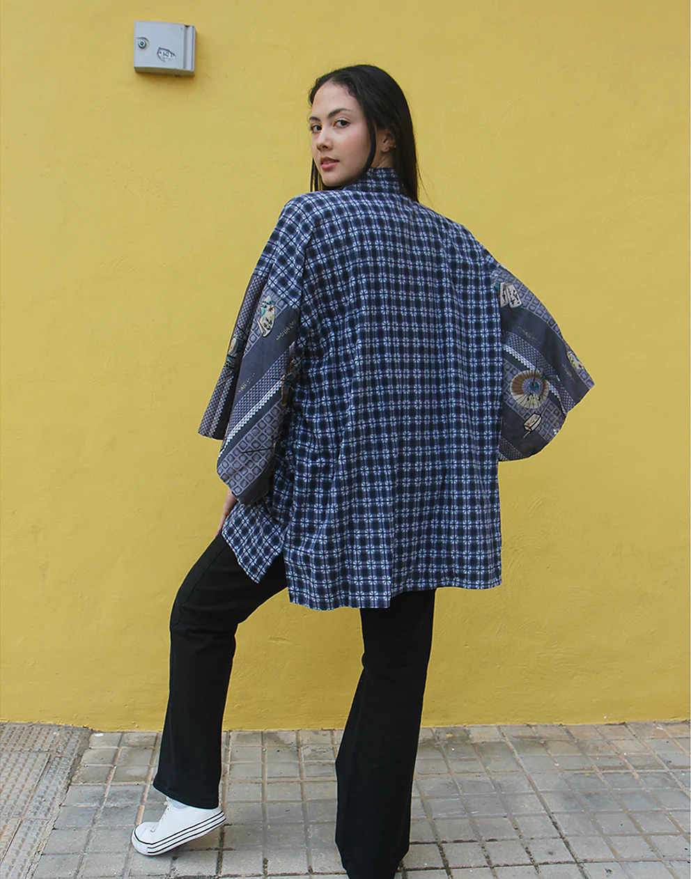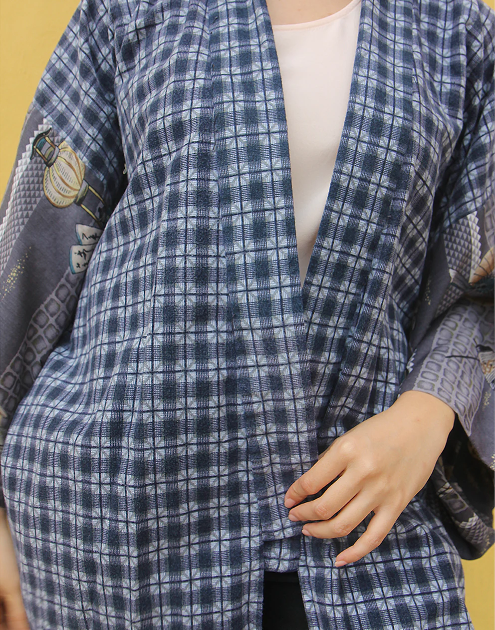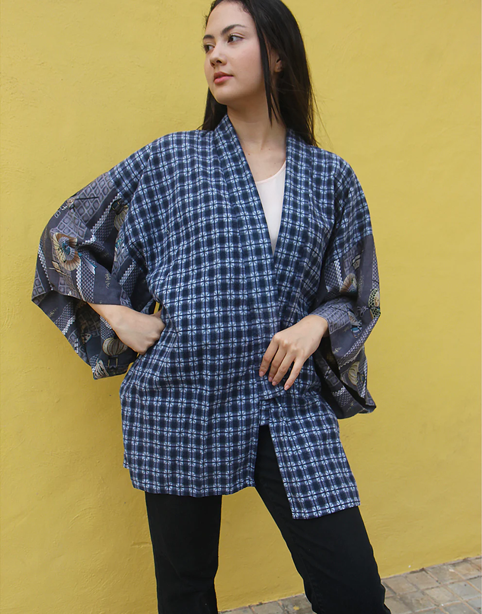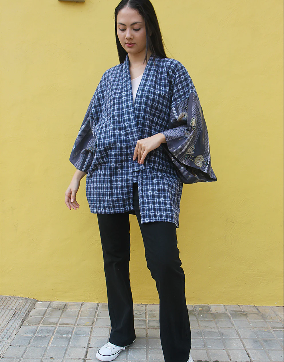 Kimono in blue printed flannel with contrasting printed sleeves.