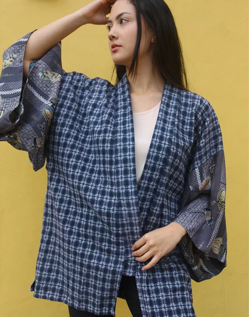 Kimono in blue printed flannel with contrasting printed sleeves.