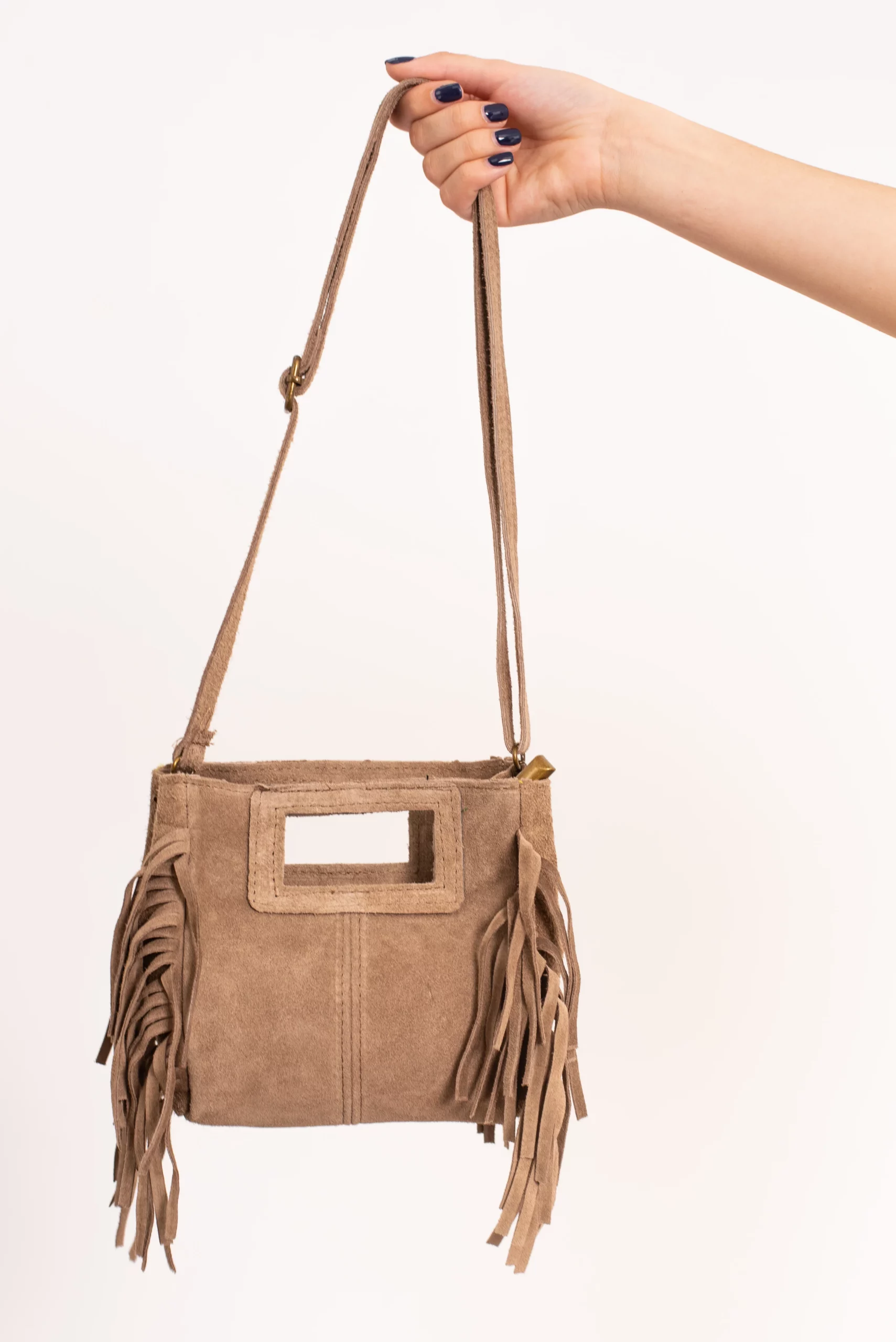 Bolso de piel, serraje. Tamaño mini del bolso Kiowa. Asa corta integrada en el bolso para llevar de mano y larga para bandolera. Flecos en ambos laterales. Cierre con cremallera.