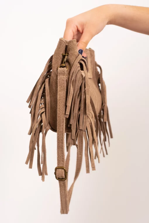 Bolso de piel, serraje. Tamaño mini del bolso Kiowa. Asa corta integrada en el bolso para llevar de mano y larga para bandolera. Flecos en ambos laterales. Cierre con cremallera.