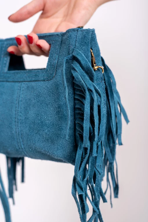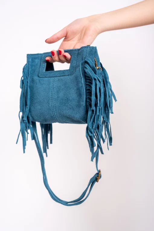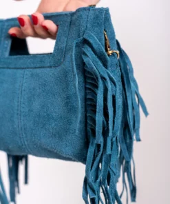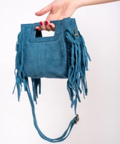 Bolso de piel, serraje. Tamaño mini del bolso Kiowa. Asa corta integrada en el bolso para llevar de mano y larga para bandolera. Flecos en ambos laterales. Cierre con cremallera.
