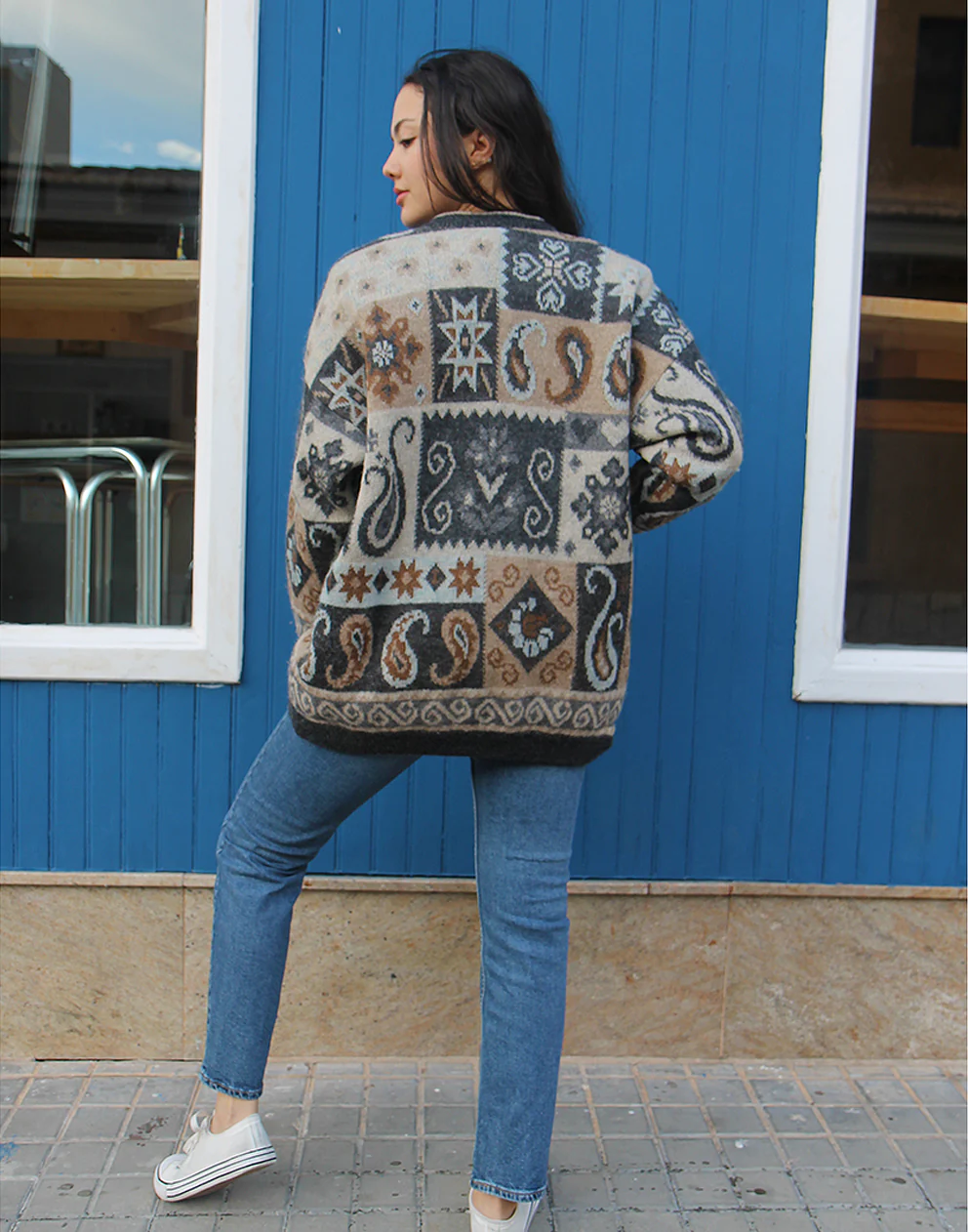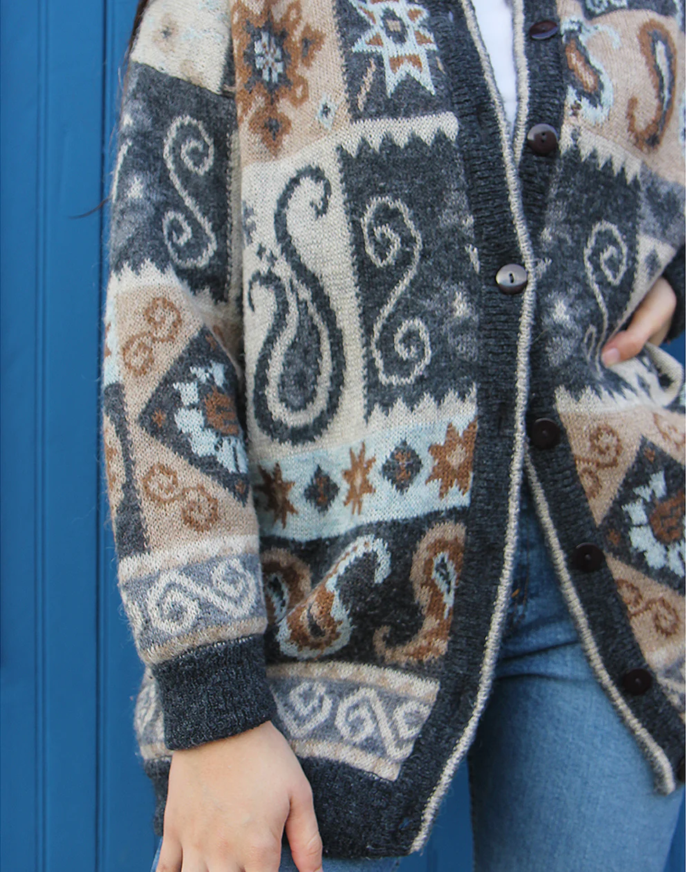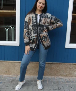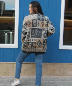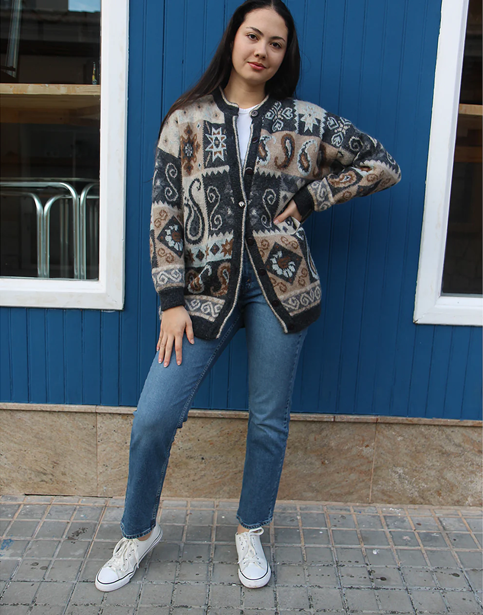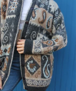 Measurements: 46″/ 117cm bust – 21″/ 53cm sleeve length – 31″ / 79cm top length.