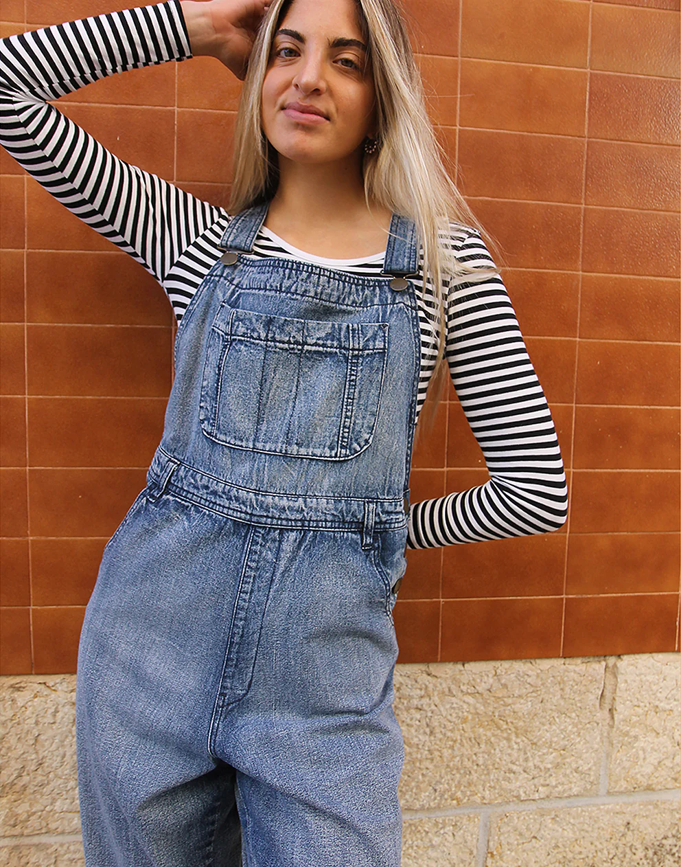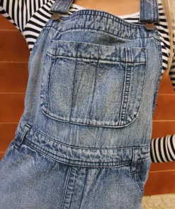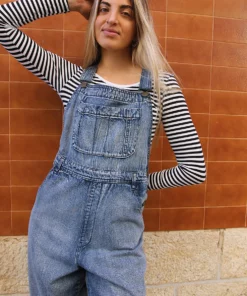 Measurements – 11″(28cm) top of bib – 17″(43cm) bottom of bib – 36″(92cm) waist – 44″(112cm) hips – 29.5″(75cm) inner leg – 14″(36cm) rise.