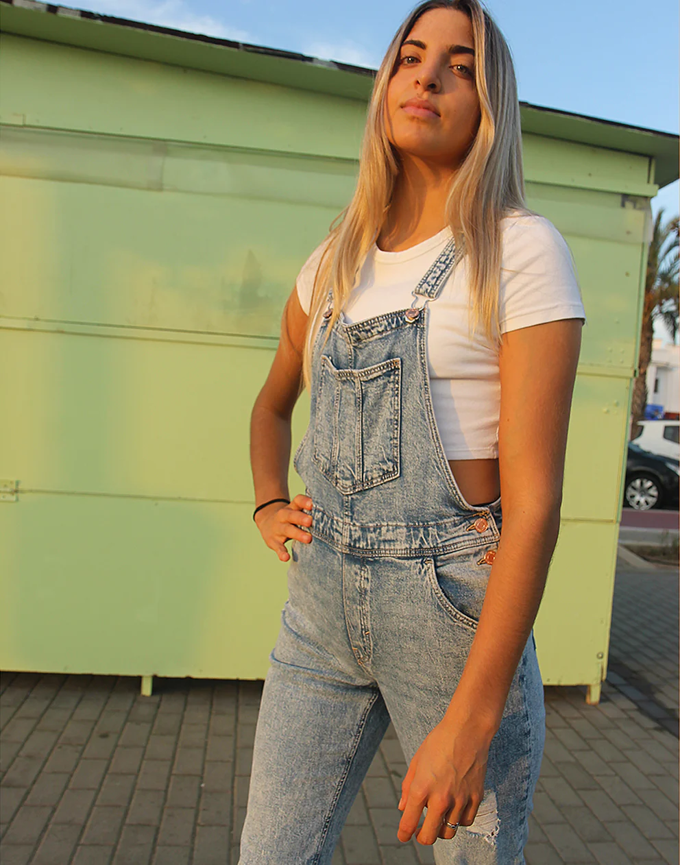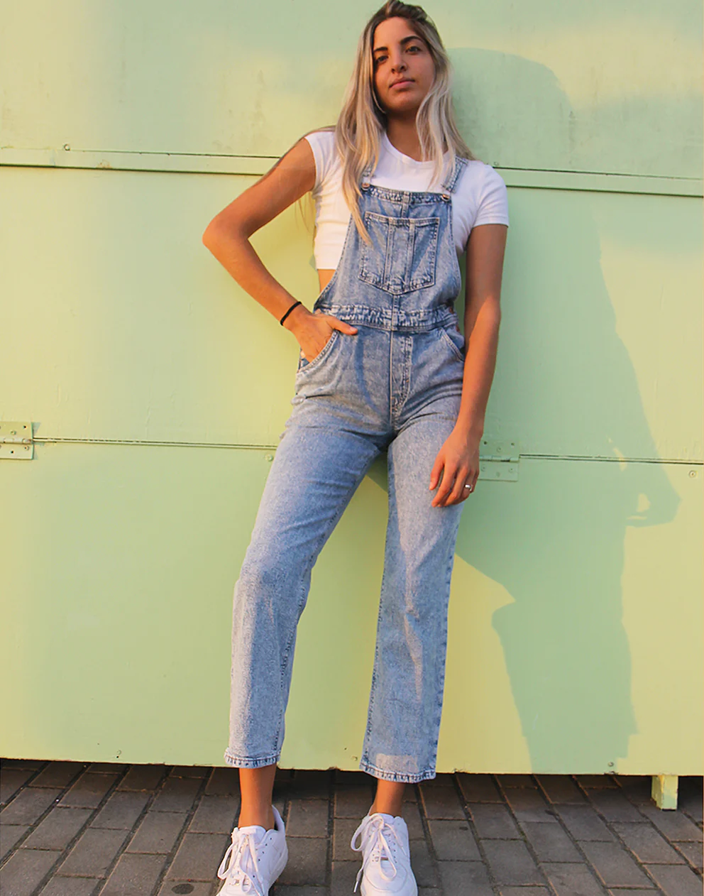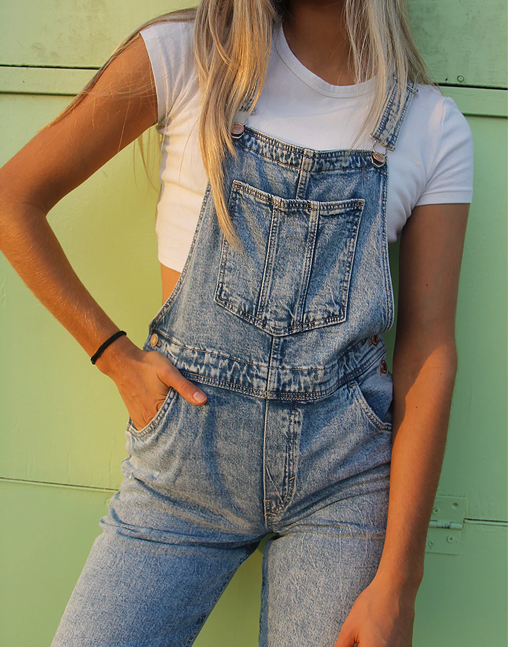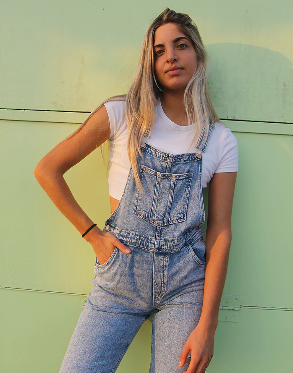 Measurements – 8″(21cm) top of bib – 13″(33cm) bottom of bib – 30″(76cm) waist – 36″(92cm) hips – 29″(74cm) inner leg – 10″(26cm) rise.