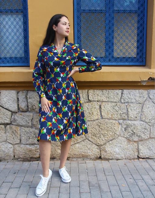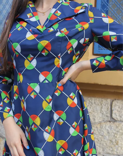 Measurements: 38″/ 97cm bust – 30″ / 76cm waist – 48″ / 122cm hips – 24″ / 61cm sleeve length – 43″ / 109cm dress length.