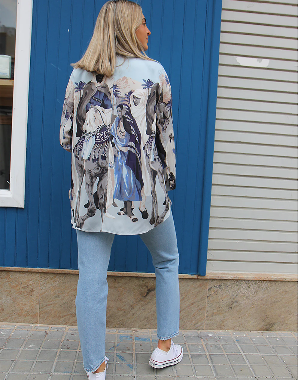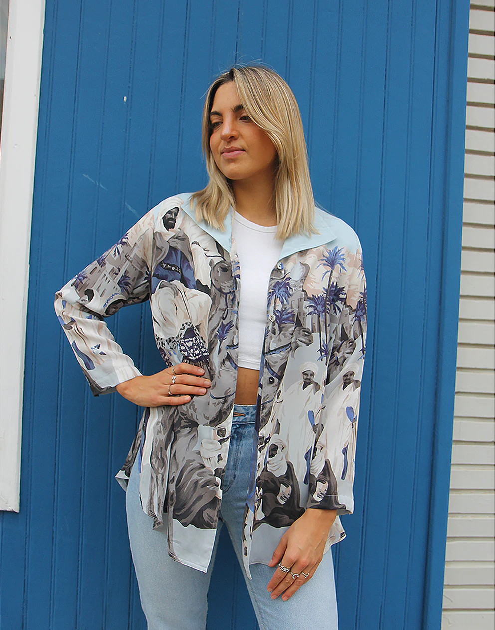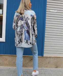 Measurements – 46″/ 117cm bust, 22″/ 56cm sleeve length, 30″/ 76cm shirt length.
