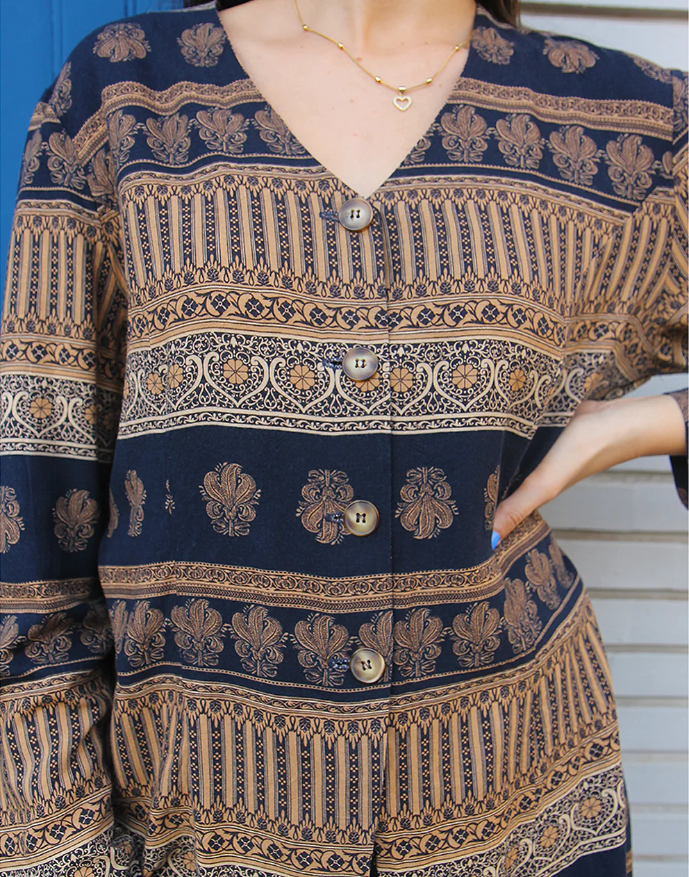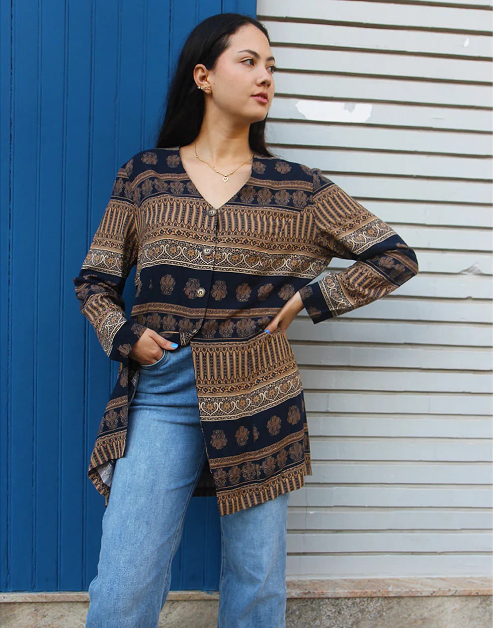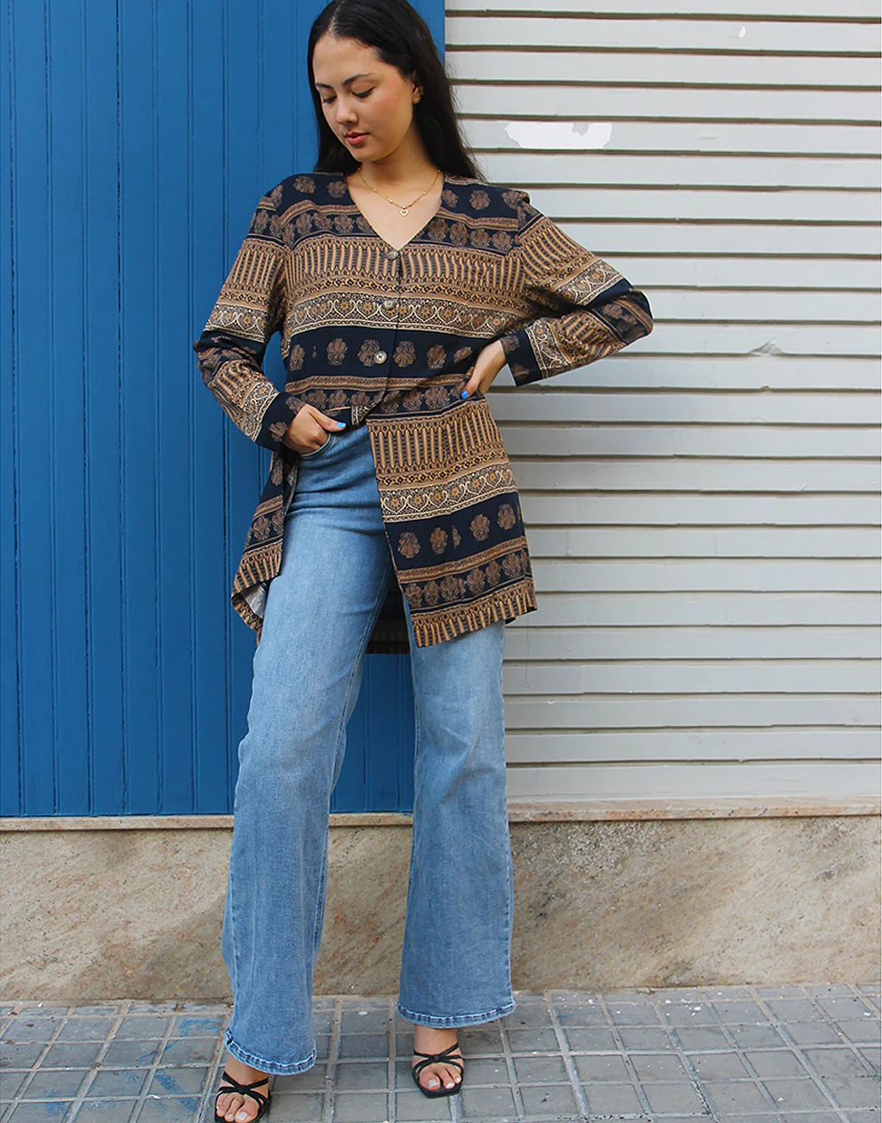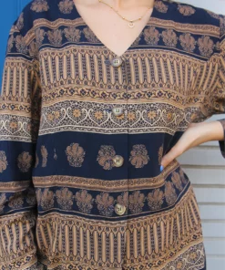 Printed shirt in brown and black print.