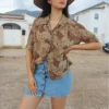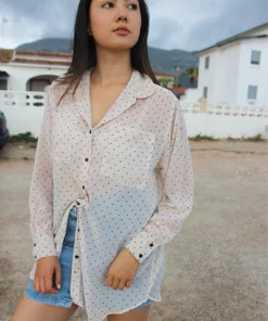 White long sleeve shirt with polkadot print.