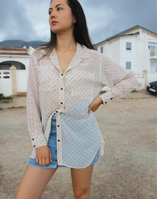 White long sleeve shirt with polkadot print.