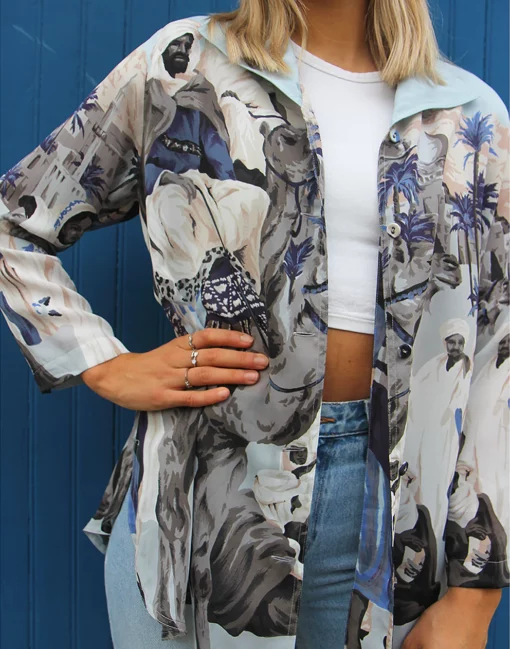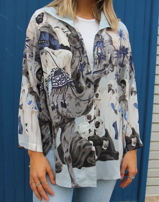 Measurements – 46″/ 117cm bust, 22″/ 56cm sleeve length, 30″/ 76cm shirt length.