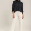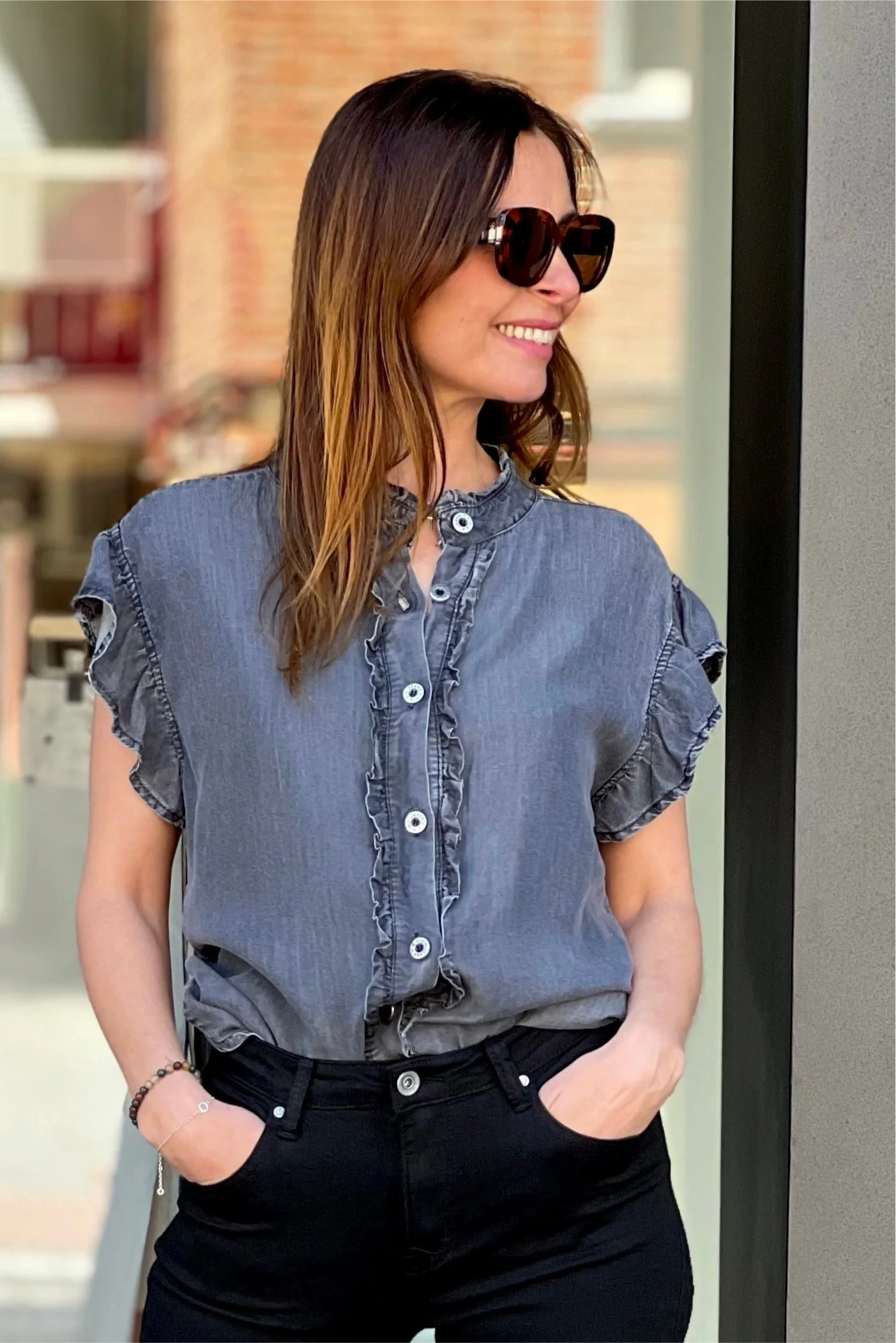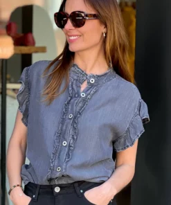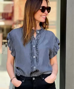 Blusa tencel efecto denim azul lavado. Cuello mao con tirilla. Sin mangas con detalle de volante sobre el hombro. Abotonado sobre el pecho.