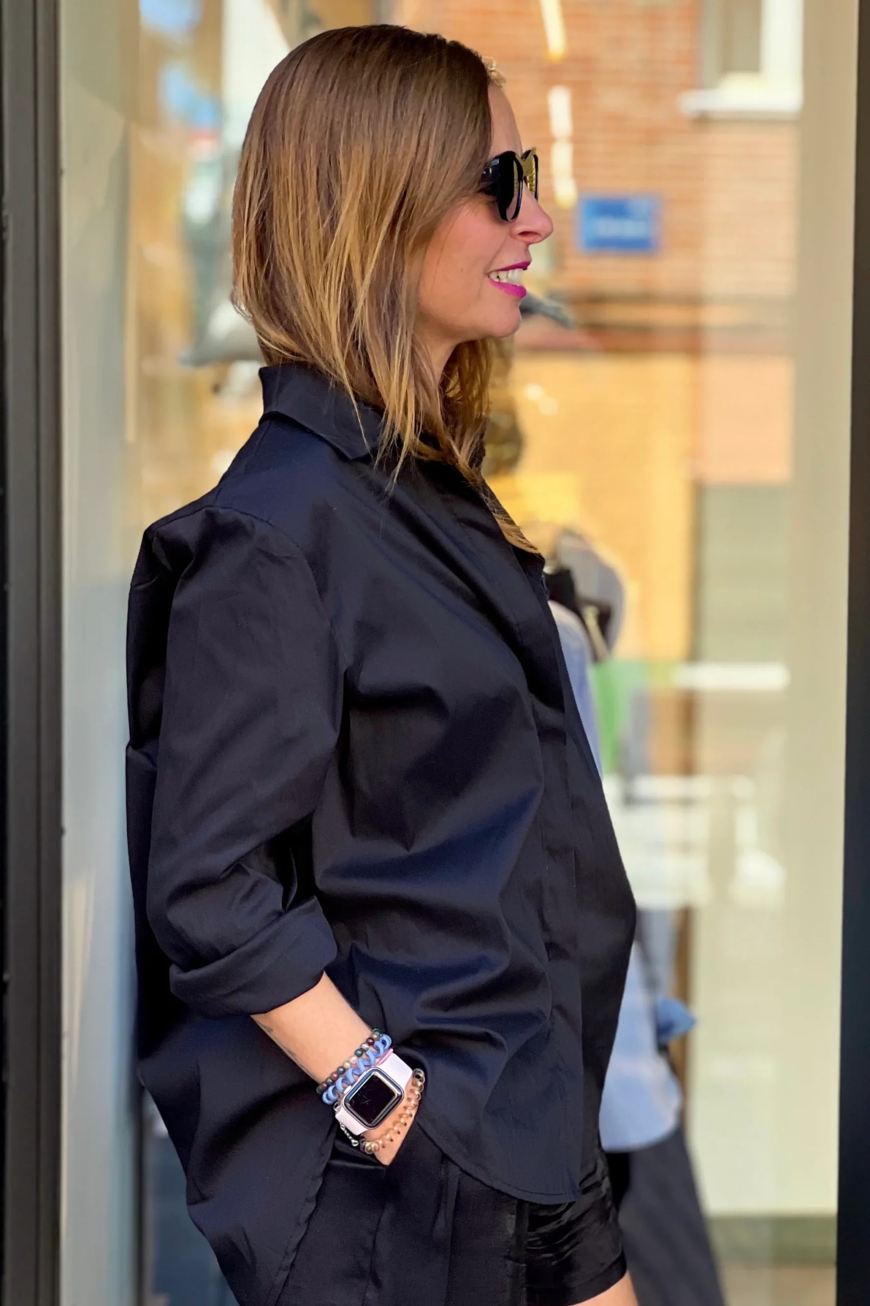 Camisa negra con corte amplio, con bajo mas largo por la espalda. Abotonado oculto con jareta. Manga larga con puño cierre botón. Un básico diferente que te encantará.